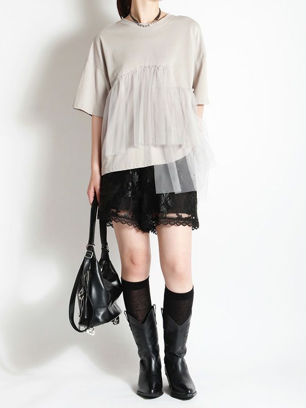 チュールレースを重ねたデザインが愛らしいショーツ。短めの着丈でトレンド感の高いアイテムです。上品な光沢の刺繍生地が大人の可憐さを演出。ブラウスで合わせてフェミニンに♪Tシャツで合わせてカジュアルに。コーデに取り入れるだけで「旬顔スタイリング」をお楽しみいただけます。合わせる小物によっても多彩な表情が楽しめるひと品、スポサンxソックス合わせや、ブーツなどにも好相性です。パンツに重ねるレイヤードスタイルもおススメです。