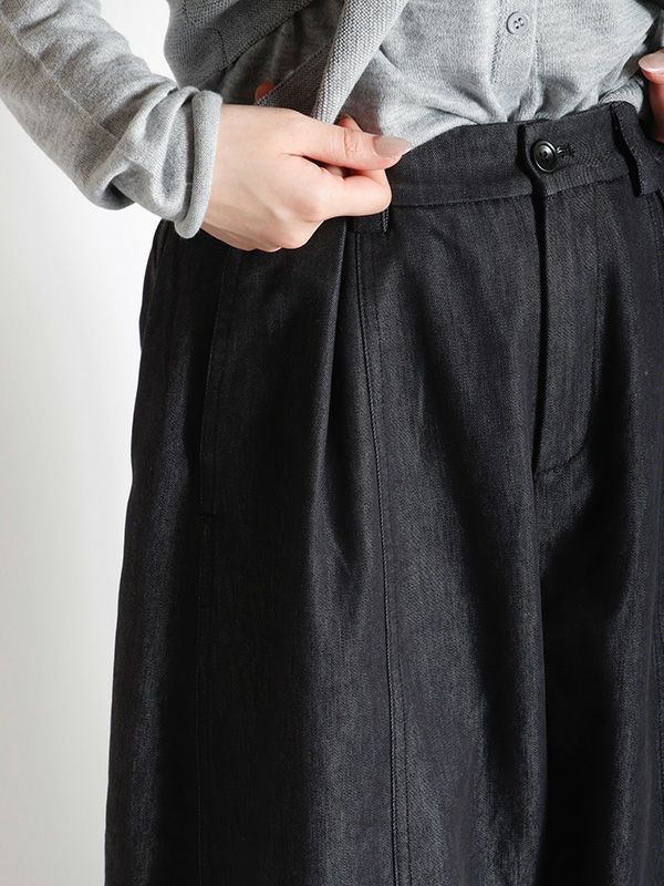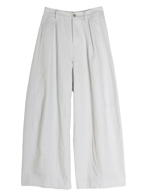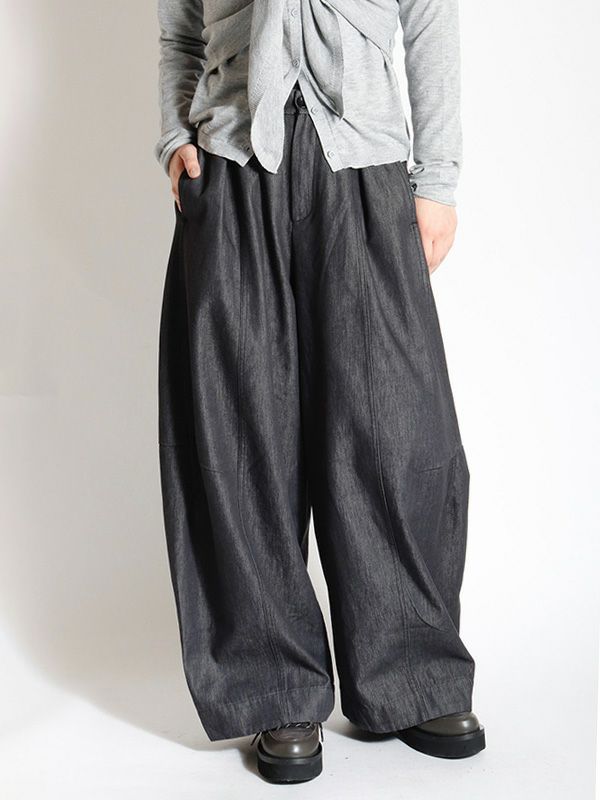 ひざ辺りで膨らむ大胆な立体的カーブデザインによる独特なシルエットが印象的なパンツ。ユッタリとしたサイズ感に加え、後ろウエストゴム仕様のリラックスした穿き心地も嬉しいポイント。シンプルなニットやカットソーを合わせてもインパクトのあるスタイリングに決まります。存在感抜群のパンツを主役に個性溢れるスタイリングを楽しんでみてはいかがでしょうか。