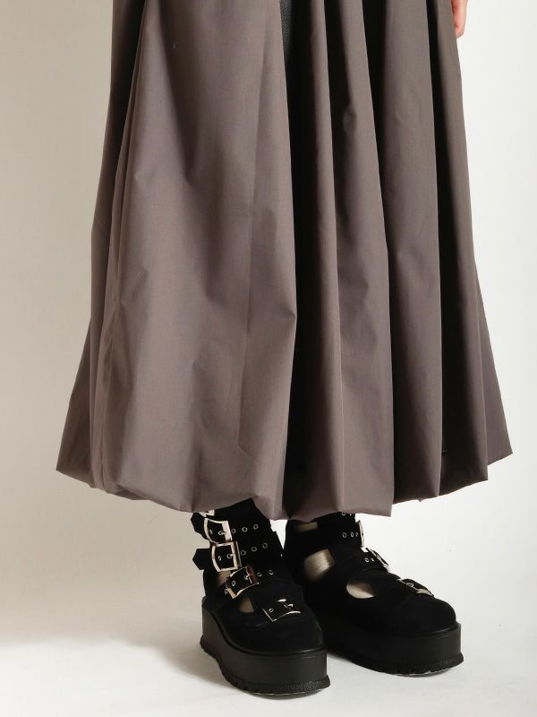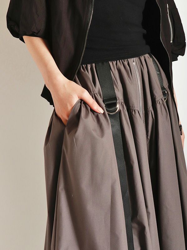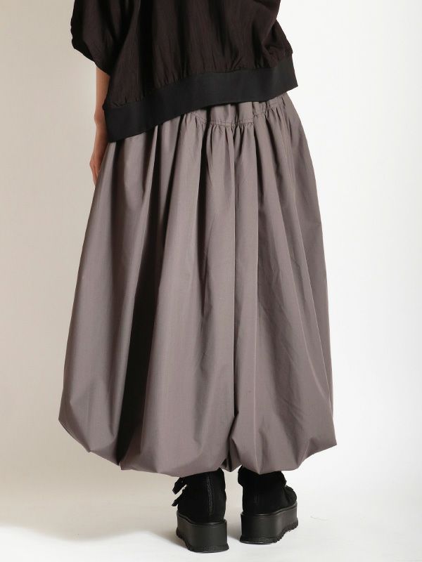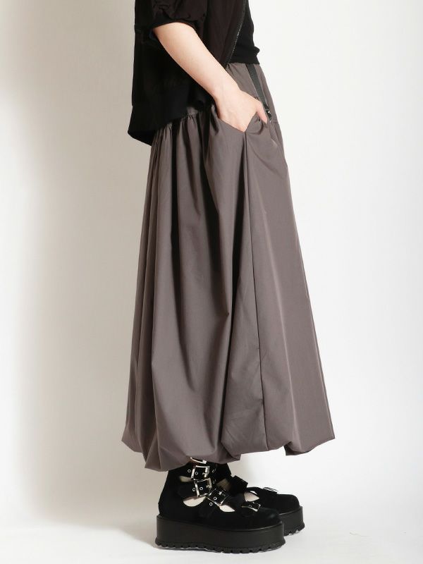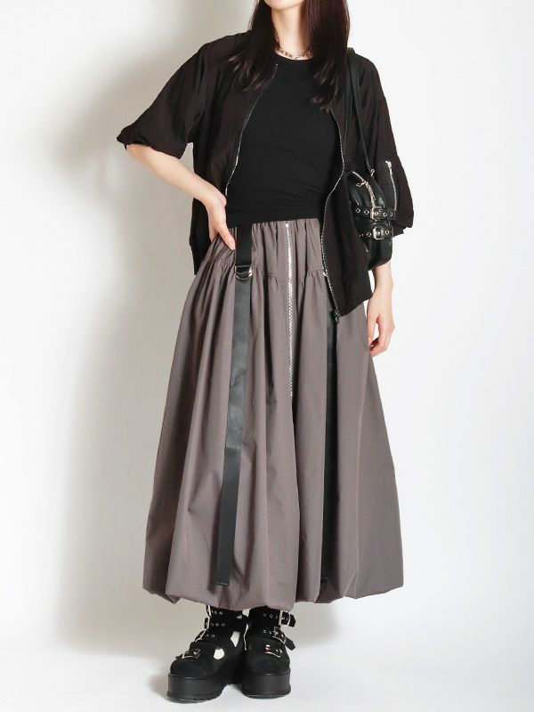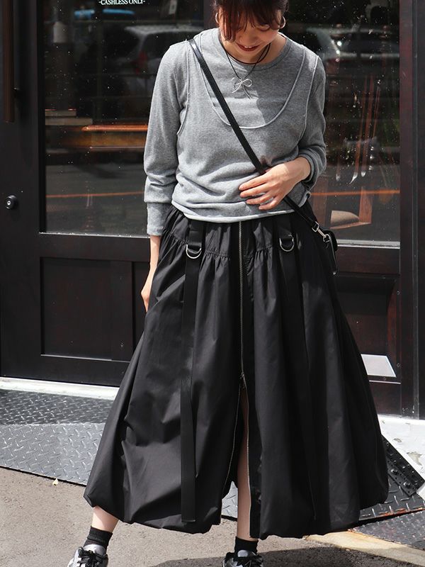 トレンドのバルーンシルエットのロングスカート。 目を引くフロントジップとサイドのベルトデザインがスタイリングのアクセントとなり、着こなしにエッジをプラス。 ふわっとした立体的なバルーンシルエットも個性的な着こなしを叶えてくれます。トップスINか短丈のトップスを合わせて、バルーンシルエットの個性を最大限に引き出したメリハリのあるスタイルがおすすめ。足元はスニーカーでカジュアルに、ブーツで秋らしい重厚感をプラスするなど、幅広いアイテムと好相性です。