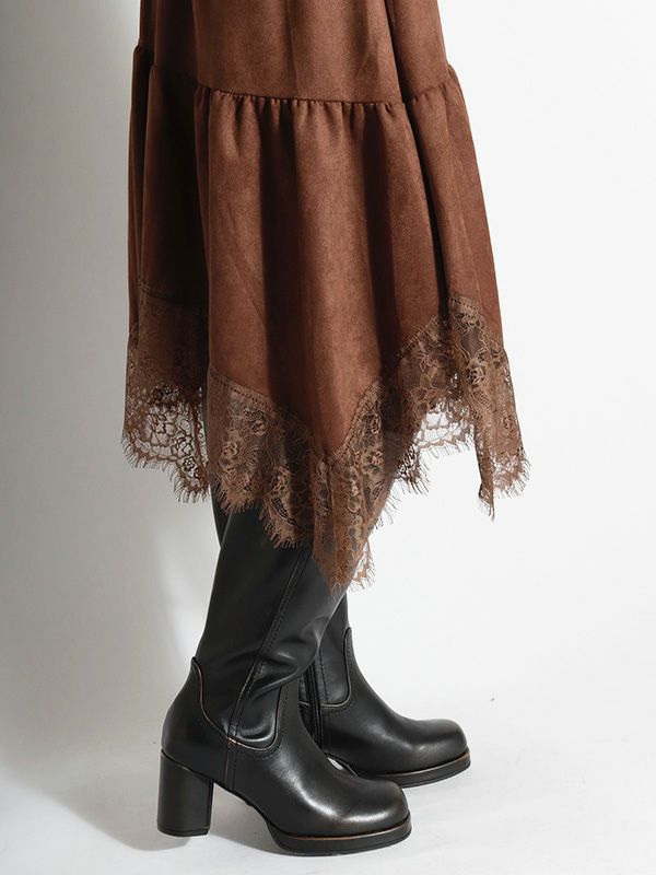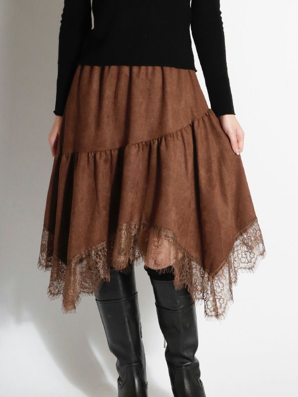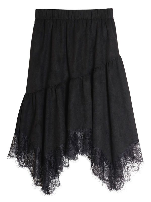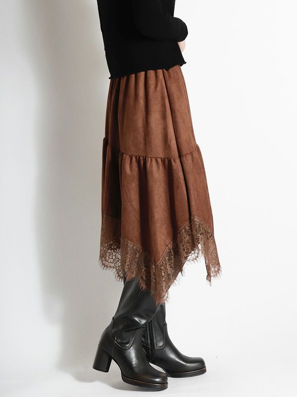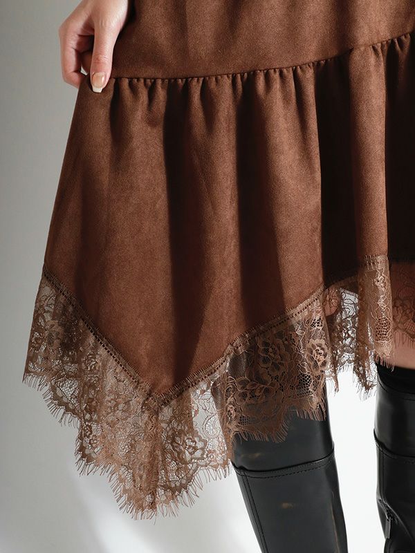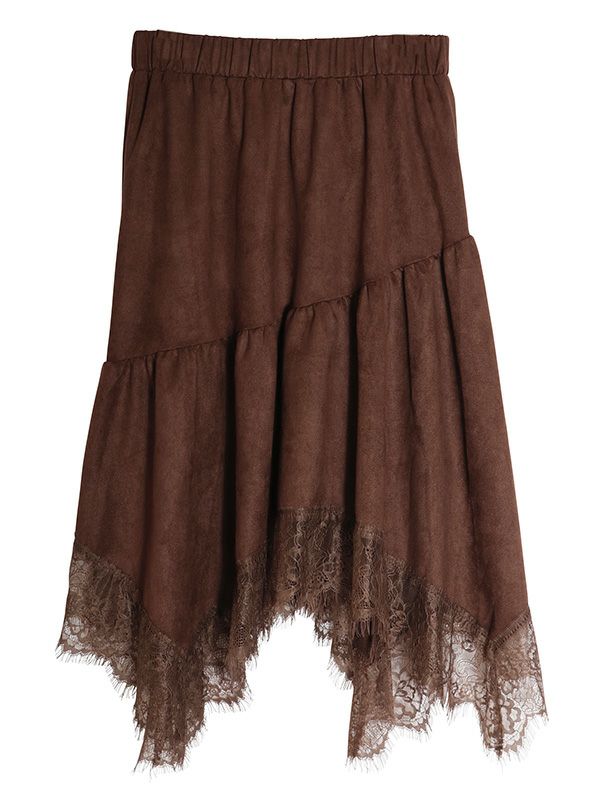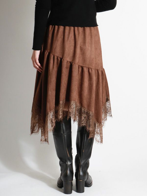 シーズンムード高まるスウェード調の素材を使用したアシンメトリースカート。裾に施したレースがフェミニンな印象をプラスしてくれます。アシンメトリーな裾部分は、歩くたびにユニークな動きと表情を生み出します。フェミニンでありながらも甘すぎない、洗練された大人のスタイルを演出。シンプルなカットソーやニットと合わせて、スカートを主役にしたスタイリングがおすすめ。寒い時期には、重くなりがちな冬のコーディネートに軽やかさをプラスします。