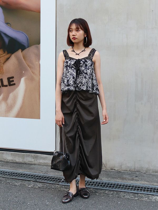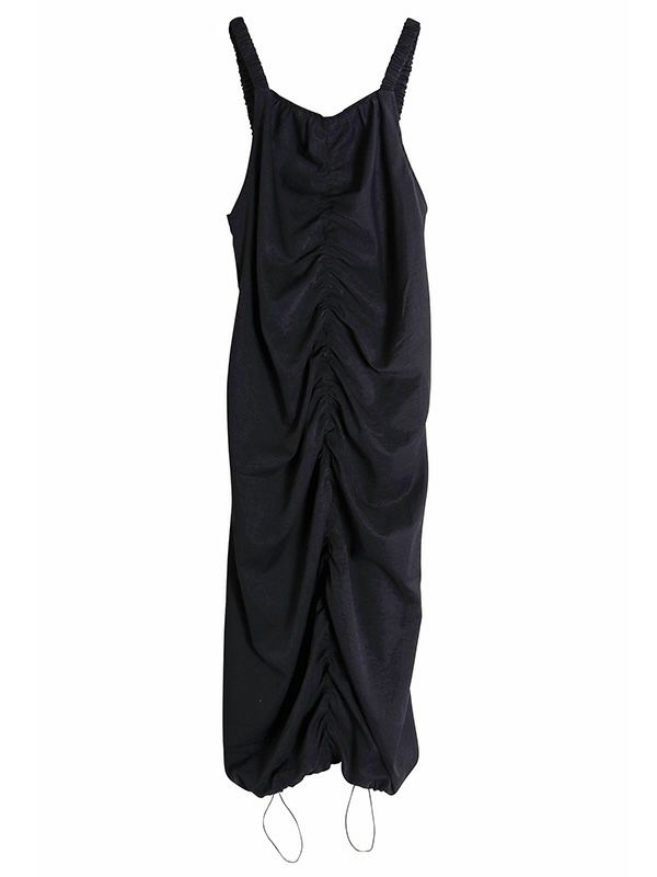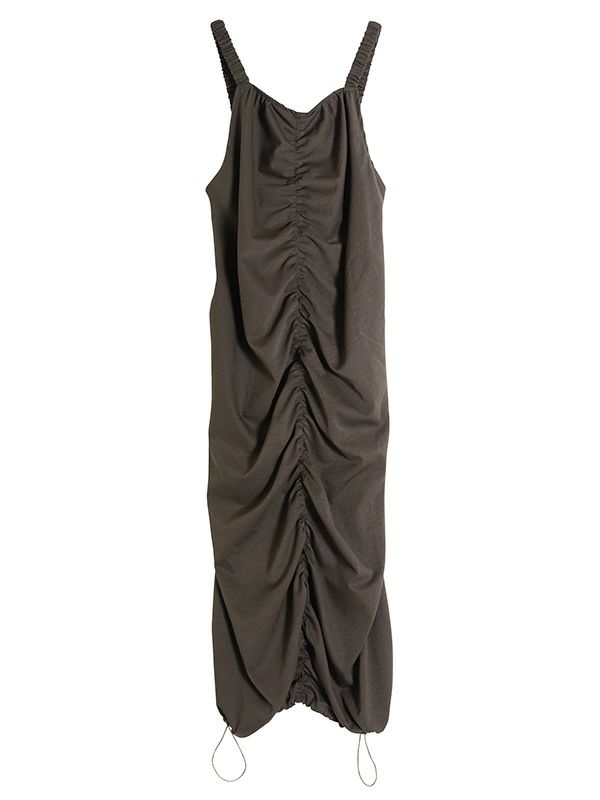 フロントに大胆なシャーリングデザインを施したキャミワンピース。クシュクシュとギャザーを寄せたストラップもさりげないアクセント。裾やバックスタイルはストリングでシルエットの調整ができ、シンプルながらもディティールにこだわったデザインです。ワーク調の雰囲気がありながらもフェミニンなアクセントが絶妙にバランスを取っているのでカジュアル過ぎない印象で着ていただけます。レイヤード次第で着こなしの幅が広がるアイテムです。