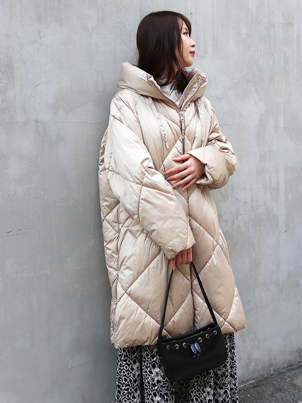 大ぶりのダイヤモンドステッチが目を引くロングコート。シンプルな着こなしの中にも存在感が感じられる1着です。体を優しく包み込むシルエットで、冬のコーディネートに華やかさを添えるひと品。 高めのハイネックフーディと両脇のジップデザインが女性らしい抜け感を演出。軽やかで保温性が高く、膝まで隠れる着丈とハイネック仕様で、冬の寒さからしっかりと守ります。抜群の保温性と防寒性や機能性に優れ、デイリーに活躍する実用的な素材のロングコートです。