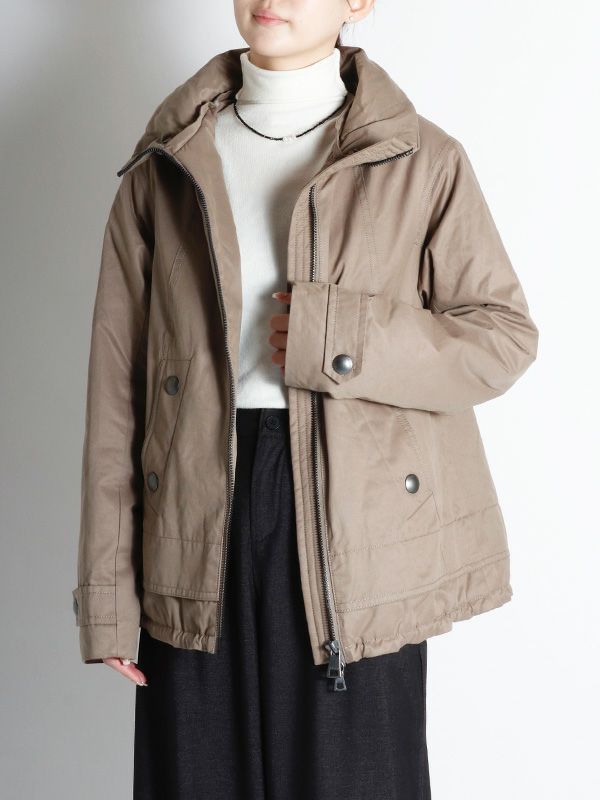 高級感のあるワックスルック生地を使用した中綿入りジャケット。キチンと感はもちろん、大人カジュアルな装いにもピッタリの1枚。バックスタイルのプリーツがスーツジャケットのような端正なアクセントを添えます。ロゴが刻印されたスナップボタン仕様。裾のドローコードが体を包み込み、防寒性とデザイン性を兼ね備えています。程良いゆとりのあるシルエット。すっきりとした丈感のボックスシルエットなのでどんなボトムスでもバランス良く決まり、スタイルアップ効果も期待できます。インナーに厚手のニットやスウェットを合わせてももたつかず、バランスの良く幅広い着こなしをお楽しみいただけます。
