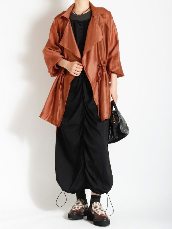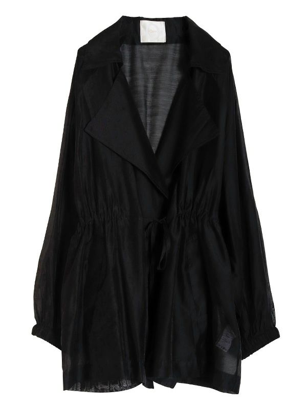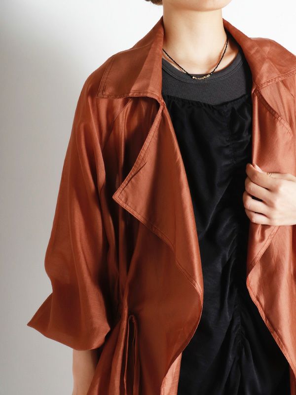 涼しげなシアー素材を使用したショートトレンチデザインのシアージャケット。 程よい透け感と、軽やかな着心地です。ウエストにドロストでシルエットを調整できるディテールを入れて、メリハリのある着こなしが叶う女性らしいデザインです。どこかセンシュアルな雰囲気で大人っぽいデザインがいつものスタイルに羽織るだけで、ジャケットスタイルをトレンドライクに格上げしてくれます。 スカートにもパンツにも合わせやすく、様々なテイストの着こなしにマッチするジャケットです。