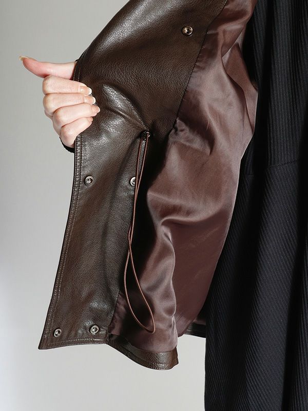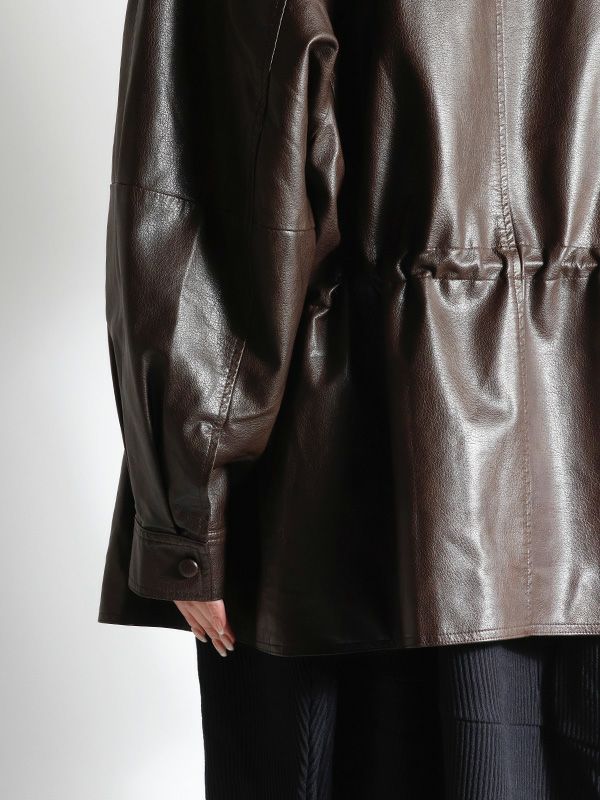 クリーンでクラシカルな佇まいのレザー調のコート。ダブルボタンの身頃でスタンドネックとしても開いて襟を寝かせた状態でも着用可能。ヒップが隠れるミドル丈なので、パンツにもスカートにも合わせやすく、オンオフ問わず幅広いシーンで活躍。洗練されたエレガントなシルエットで、羽織るだけでいつものコーディネートをワンランクアップさせてくれます。ガウンのようにラフに羽織ったり、ウエスト部分のギャザーを寄せてウエストマークしたスタイルもお楽しみいただけます。