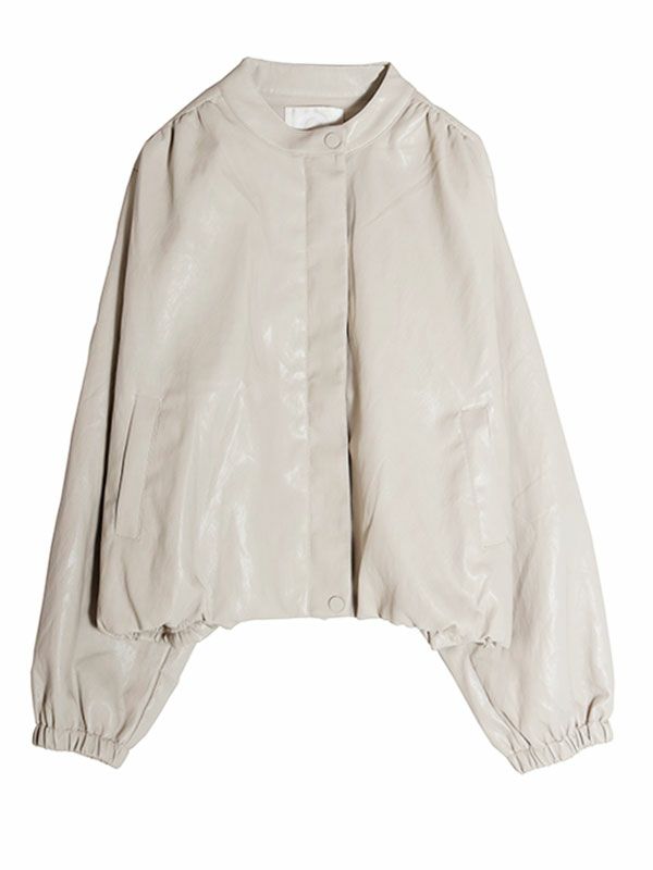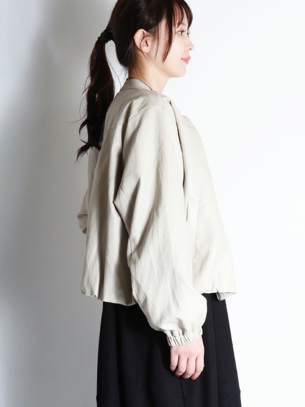 すっきりとしたノーカラーと、きれい見えする雰囲気あるノーカラーのフェイクレザーブルゾン。裾のギャザーデザインから生まれる丸みのあるシルエットを楽しめます。さっと羽織るだけでお洒落映えする1枚。カジュアルなパンツスタイルにはもちろん、甘めのワンピースやスカートにも合わせるのもおすすめです。比翼仕立てで装飾を抑えているすっきりとした印象で上品な大人魅せアウターです。