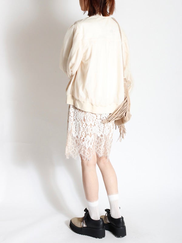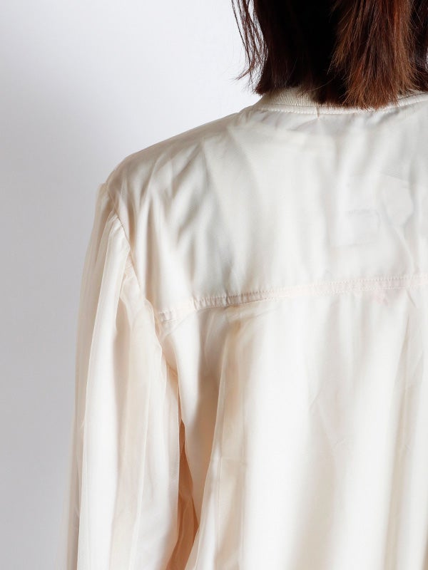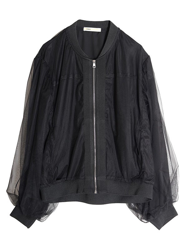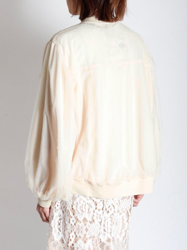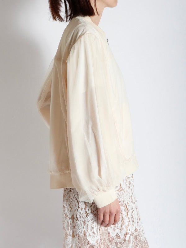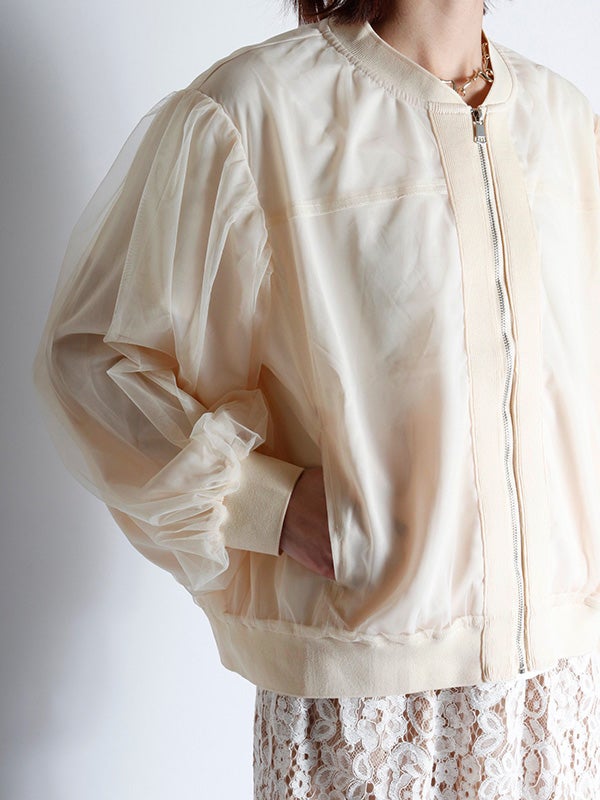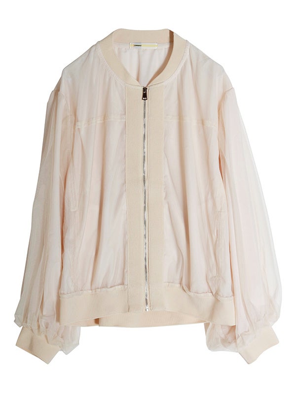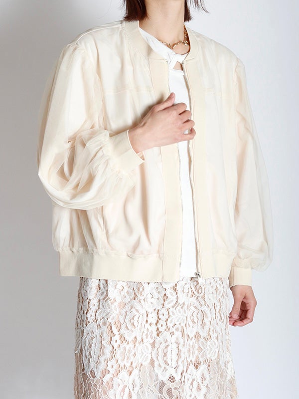 シアー生地にふんわりとチュールを重ねた、奥行きのある表情が魅力のブルゾン。コンパクトながら、身幅にゆとりを持たせたデザインです。袖にボリュームを作ることで手元にシアーなクッションが溜まり、1着で旬のバランスを叶えてくれます。ロゴTシャツや柄トップスをインナーに選び、透ける文字や柄を楽しむスタイルもおススメです。デニムパンツでカジュアルに、タイトスカートで女性らしくと、合わせるボトムスを選ばないブルゾンです。