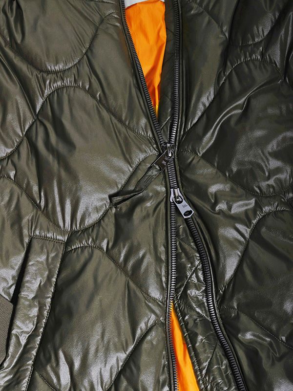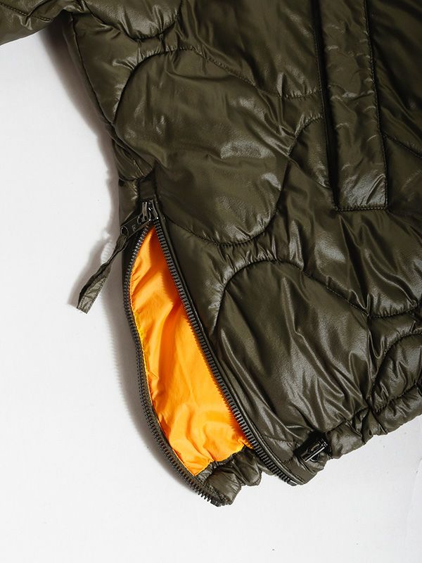 温かなボア裏地のフードトップまで続くダブルファスナーのフルジップが印象的で、表素材には柔らかく美しい艶を放つシャイニーナイロンを採用しウェーブ柄のキルティングを施した表情豊かなブルゾン。包まれるような優しい着心地を体感できるフーデッド中綿ジャケットです。フロントはダブルジップ仕様で、デザイン性と機能性を両立。程よいボリューム感がありながらも、着膨れしないすっきりとしたシルエットで、様々なスタイルに馴染みます。トレンドに左右されない普遍的なモデルで、長く愛用され続けている人気アイテムです。