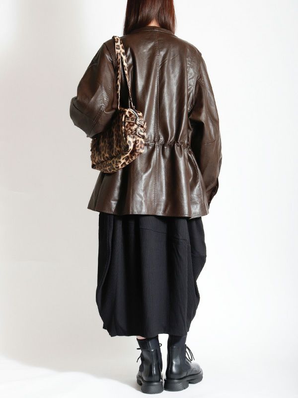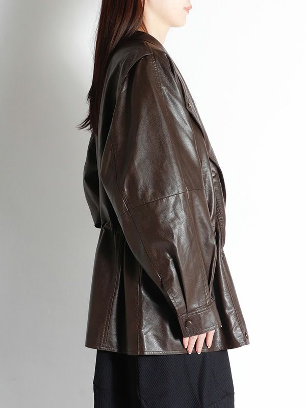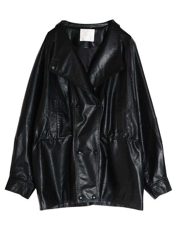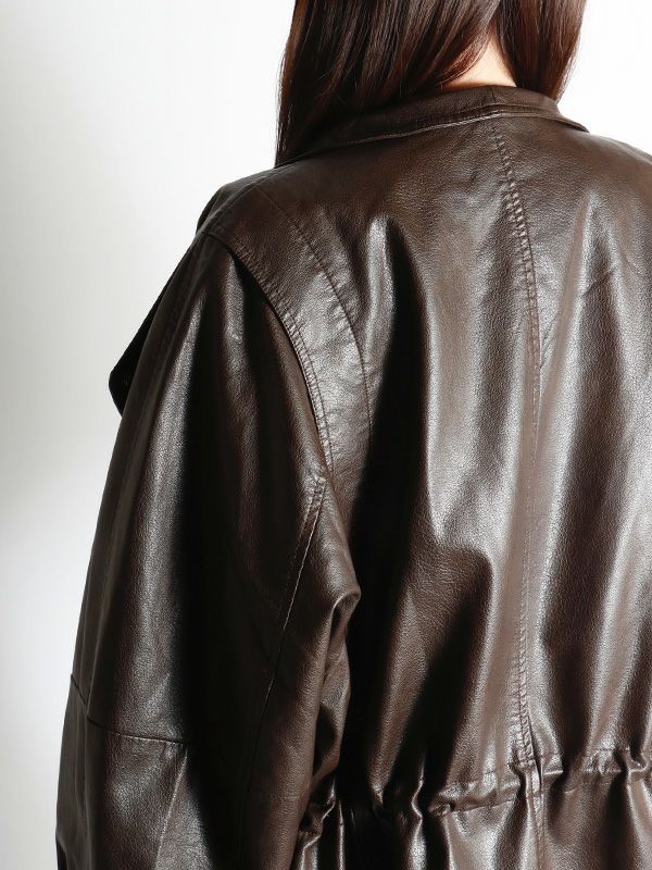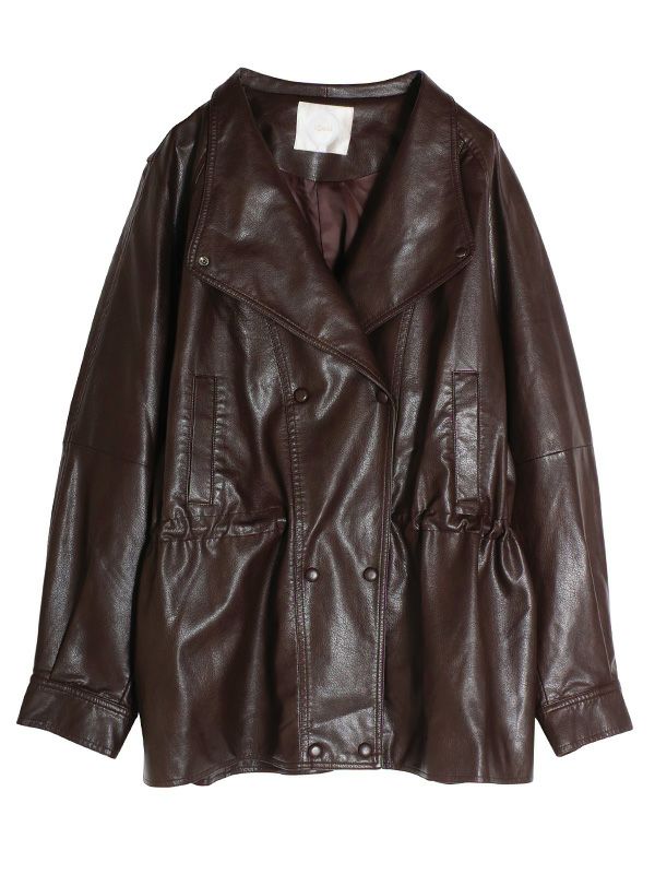 クリーンでクラシカルな佇まいのレザー調のコート。ダブルボタンの身頃でスタンドネックとしても開いて襟を寝かせた状態でも着用可能。ヒップが隠れるミドル丈なので、パンツにもスカートにも合わせやすく、オンオフ問わず幅広いシーンで活躍。洗練されたエレガントなシルエットで、羽織るだけでいつものコーディネートをワンランクアップさせてくれます。ガウンのようにラフに羽織ったり、ウエスト部分のギャザーを寄せてウエストマークしたスタイルもお楽しみいただけます。