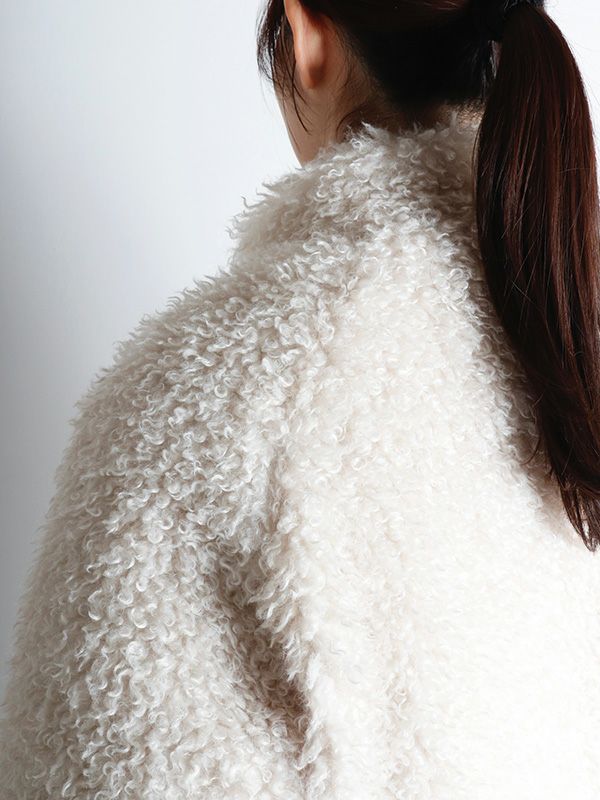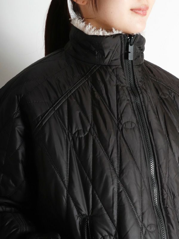 毛足の長さとボリュームのある柔らかな肌触りが魅力のフェイクファーで仕立てたリバーシブルブルゾン。ファーの面を裏返すことで、ウェーブステッチのキルティングを施したナイロンブルゾンになります。細やかなウェーブステッチから生まれる立体感がさり気ないアクセントになり、大人の女性らしいこなれ感を演出してくれるデザインです。ラグランスリーブデザインで肩のラインがキレイに落ち、肩幅を問わずストレスなく着用いただけます。包み込まれるような柔らかさと、ボリューム感がありながらも美しいシルエットを兼ね備えた大人のためのブルゾンです。