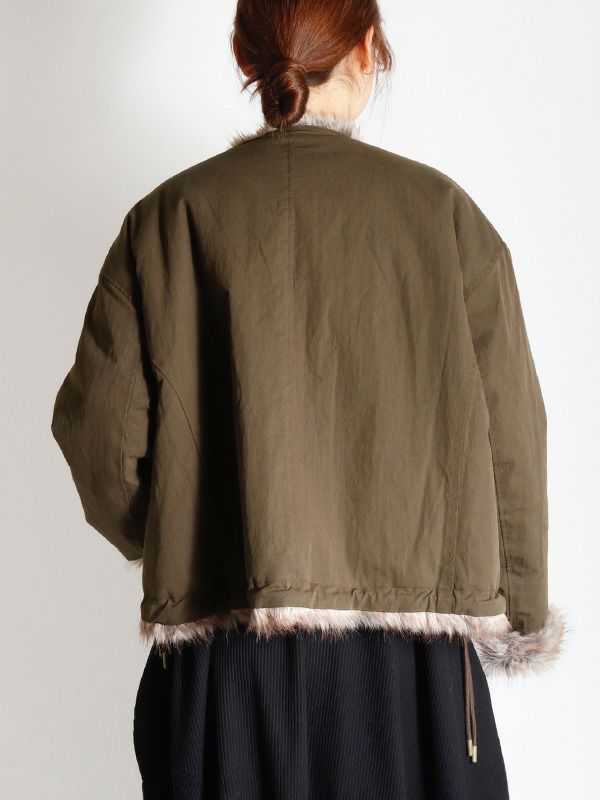 ミンクのような毛並みと、ボリュームのある柔らかな肌触りが魅力のフェイクファーとアクティブな印象のシャリ感のあるノーカラーブルゾンの2つのまったく異なる表情が楽しめるリバーシブルブルゾン。ノーカラーのスッキリとしたネックラインが着用時に抜け感のある動きを生みます。身幅と袖にたっぷりとゆとりを持たせたシルエットにややコンパクトな着丈。裾のストリングでシルエットの調整をしていただけます。
