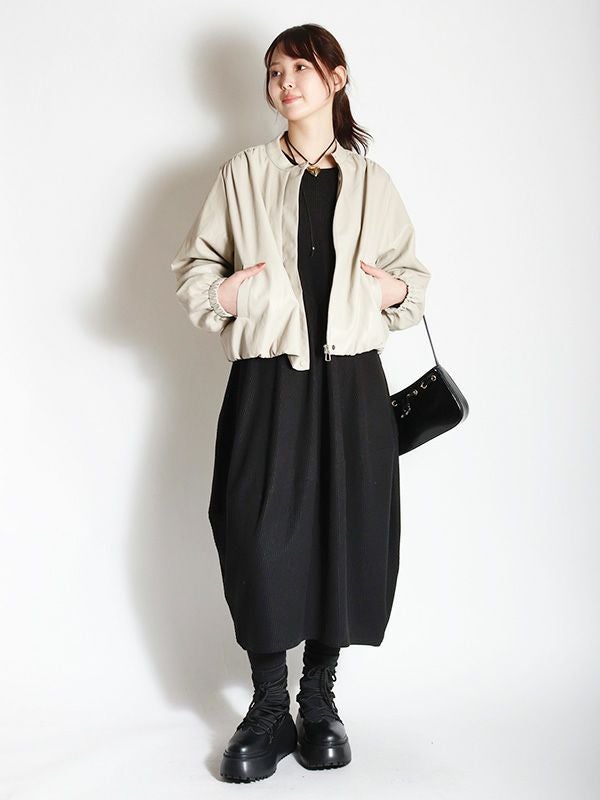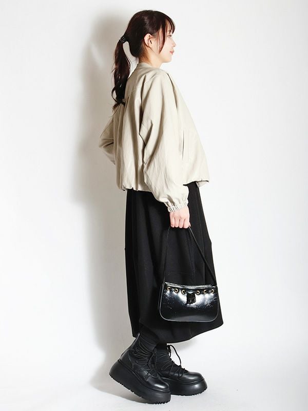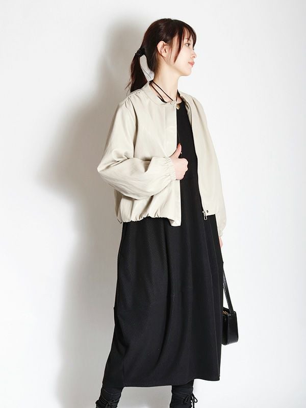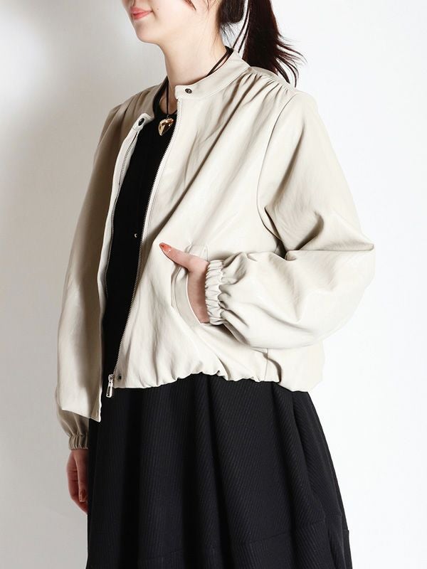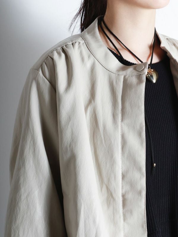 すっきりとしたノーカラーと、きれい見えする雰囲気あるノーカラーのフェイクレザーブルゾン。裾のギャザーデザインから生まれる丸みのあるシルエットを楽しめます。さっと羽織るだけでお洒落映えする1枚。カジュアルなパンツスタイルにはもちろん、甘めのワンピースやスカートにも合わせるのもおすすめです。比翼仕立てで装飾を抑えているすっきりとした印象で上品な大人魅せアウターです。