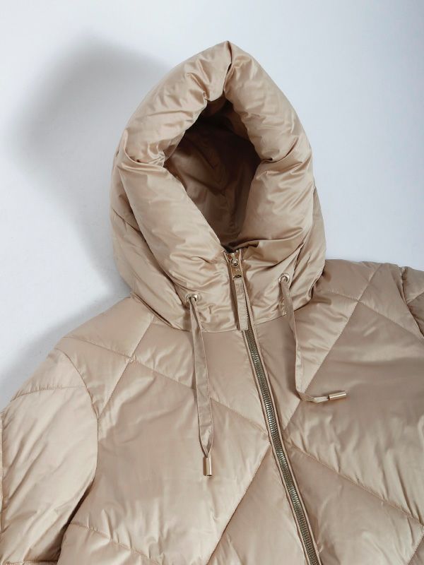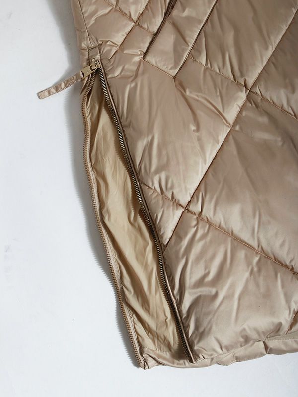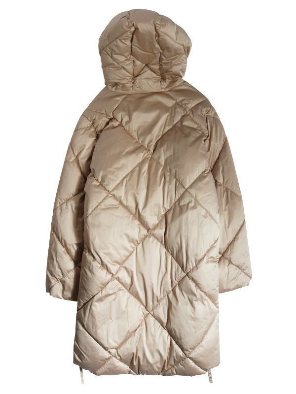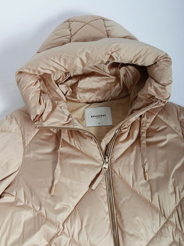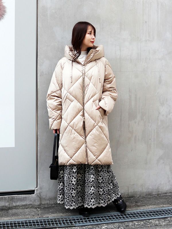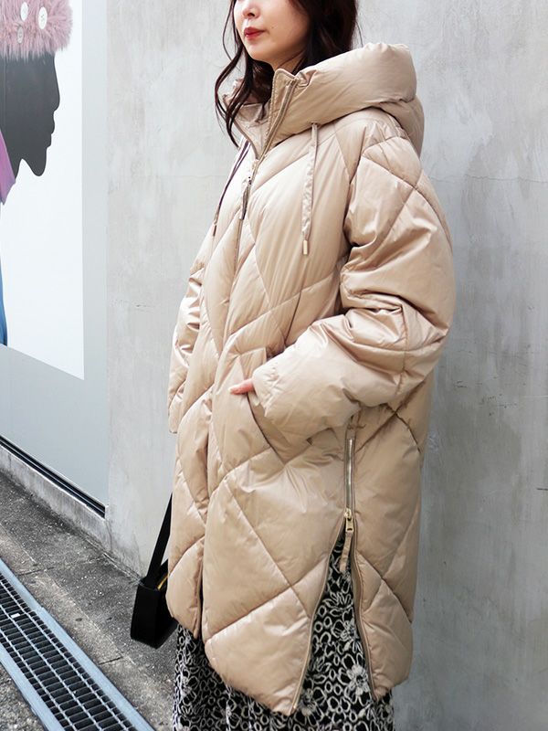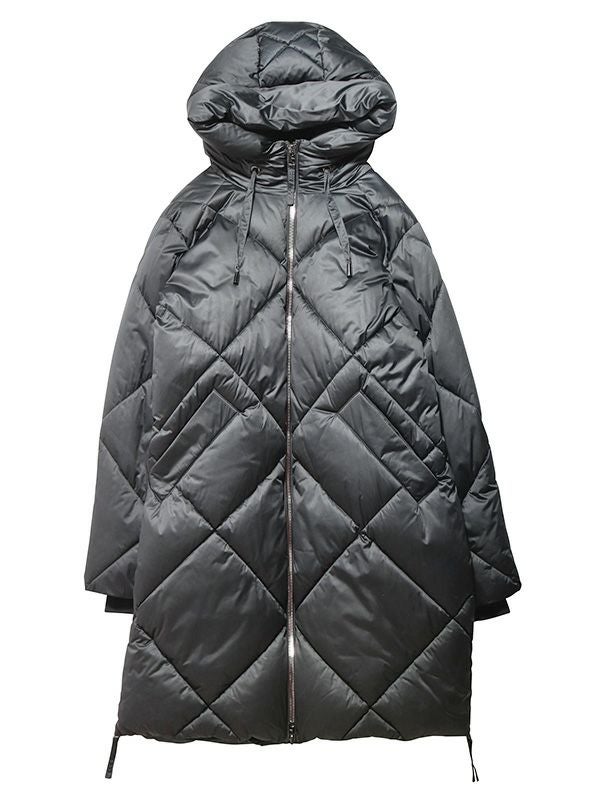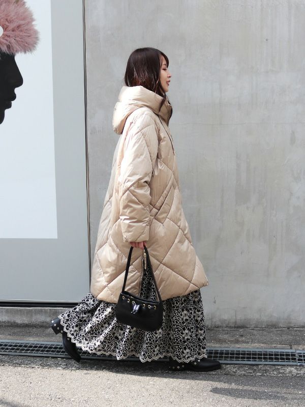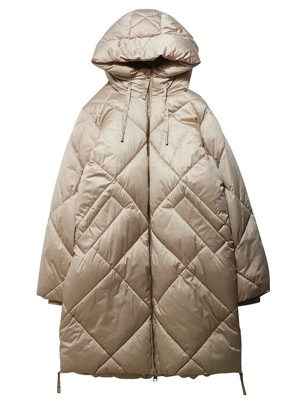 大ぶりのダイヤモンドステッチが目を引くロングコート。シンプルな着こなしの中にも存在感が感じられる1着です。体を優しく包み込むシルエットで、冬のコーディネートに華やかさを添えるひと品。 高めのハイネックフーディと両脇のジップデザインが女性らしい抜け感を演出。軽やかで保温性が高く、膝まで隠れる着丈とハイネック仕様で、冬の寒さからしっかりと守ります。抜群の保温性と防寒性や機能性に優れ、デイリーに活躍する実用的な素材のロングコートです。