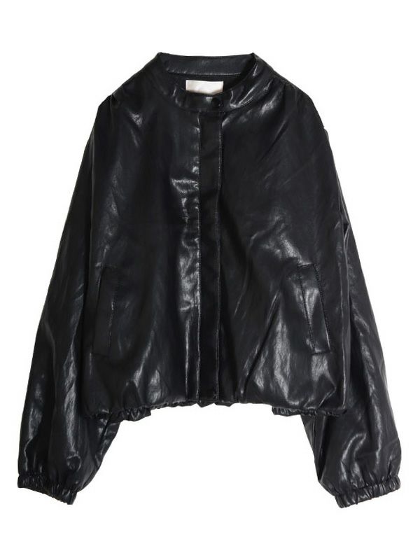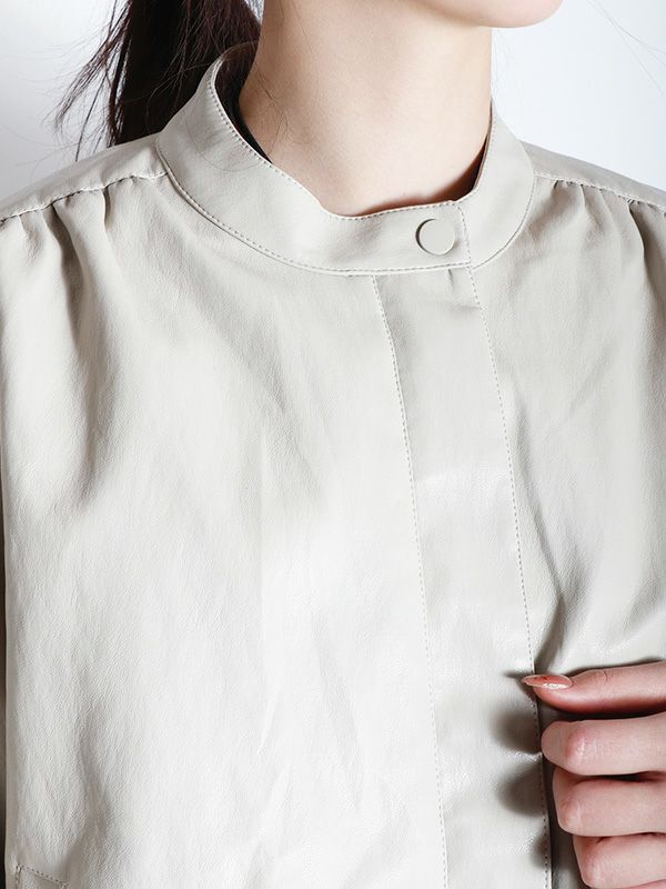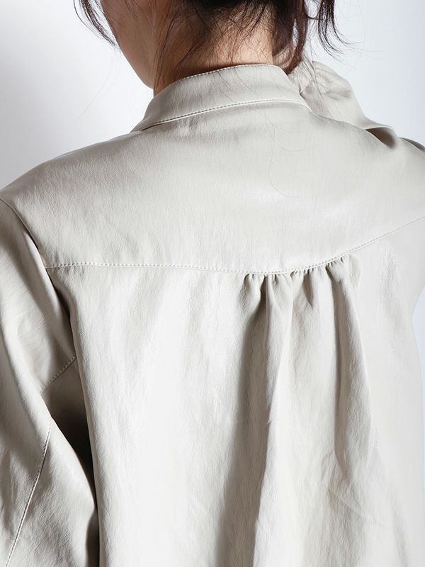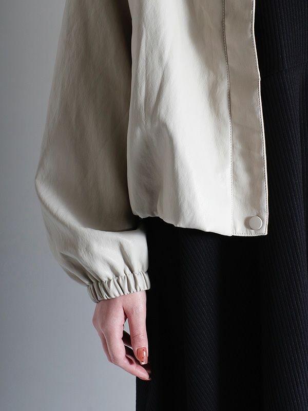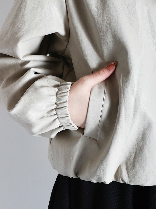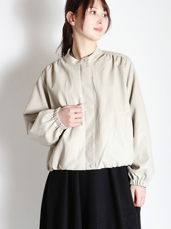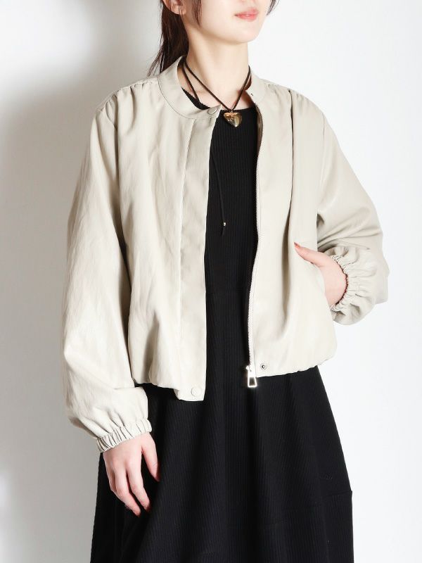 すっきりとしたノーカラーと、きれい見えする雰囲気あるノーカラーのフェイクレザーブルゾン。裾のギャザーデザインから生まれる丸みのあるシルエットを楽しめます。さっと羽織るだけでお洒落映えする1枚。カジュアルなパンツスタイルにはもちろん、甘めのワンピースやスカートにも合わせるのもおすすめです。比翼仕立てで装飾を抑えているすっきりとした印象で上品な大人魅せアウターです。