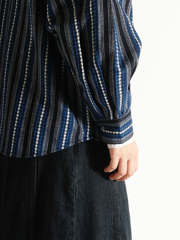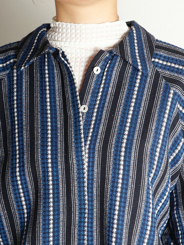 フランス〈THE GOOD FAMILY(ザ・グッド・ファミリー)〉のクラシックな印象のストライプ織生地のシャツ。細かなストライプ柄の仕立てと、落ち着いた配色が魅力的です。太めのラグランスリーブがふんわりと立体感を演出。 コンパクトなシャツ襟と第一ボタンを無くしたネックデザインが首まわりをすっきりと見せ、モードな印象を引き立てます。ゆったりとしたシルエットで、体のラインを拾わずリラックスして着こなせます。そのまま一枚で羽織ったり、中に薄手のタートルネックなどを重ねたりしやすいサイズ感です。