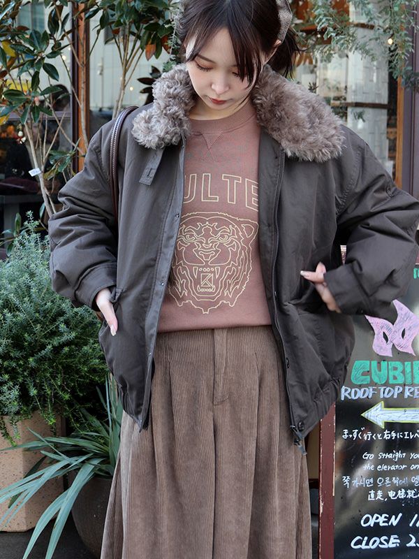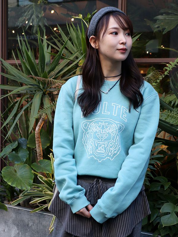 ニュアンスカラーのボディにプリントは古着にありそうなキャッチーなタイガーデザインをチョイス。柔らかな色味で強気なタイガーが中和されて大人のカジュアルにピッタリな仕上がりです。裏面はヴィンテージスウェットで使われているような起毛裏毛を使用。ふっくらとした風合いと優しい肌ざわりです。着るだけでコーディネートにこなれ感をもたらしてくれて、デニムやチノパンとのラフな雰囲気で合わせていただくのはもちろん、スラックスやロングスカートとカジュアルスタイルをお楽しみいただくのもおすすめ。インナーにシャツやタートルネックのトップスを合わせてレイヤードをお楽しみいただくのも◎。