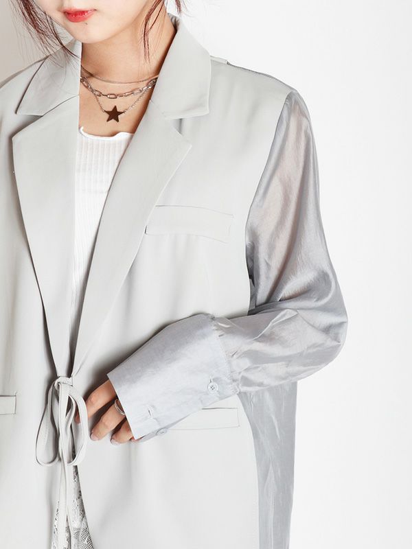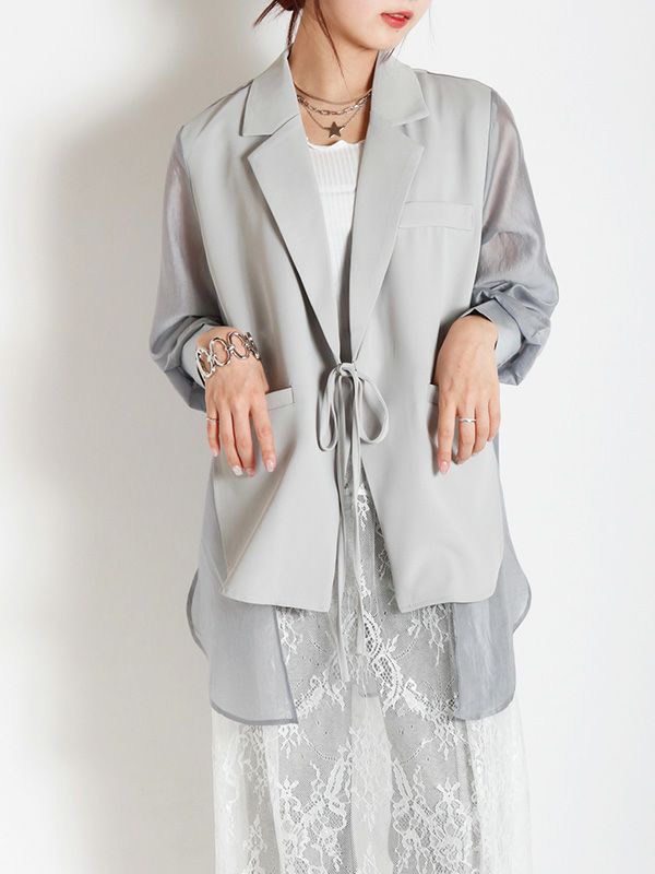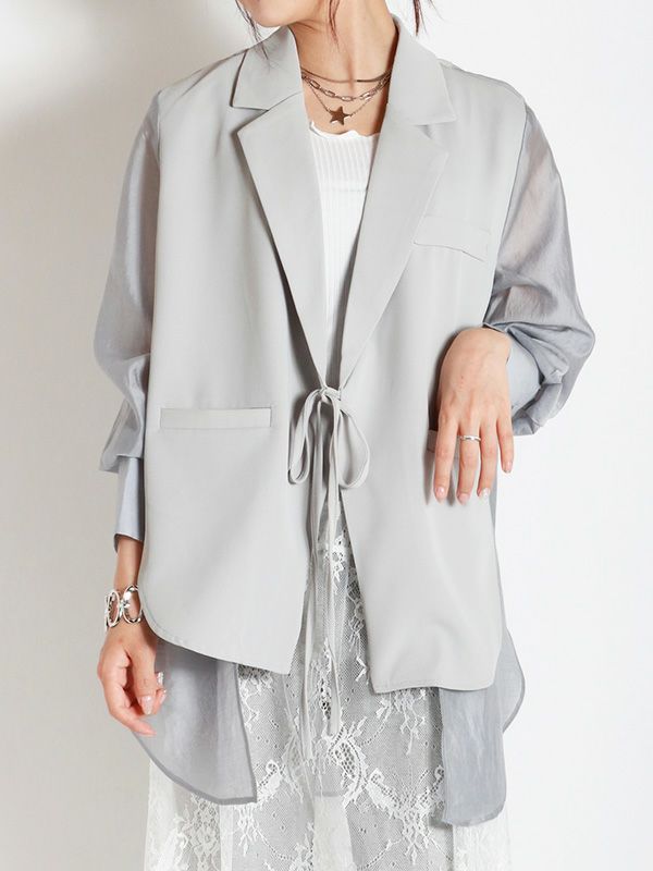 大人気のシアージャケットがバージョンアップ&新色で入荷しました!オーガンジーのシアー感のある素材を使用し、異素材で切り替えた珍しいデザインの変化球ジャケット。フロントのストリングデザインも程よい抜け感をプラスしてくれます。暑くなると質感が気になるジャケットも透け感素材だと重くならないのが◎ オーガンジー素材の張り感があるので形がきれいに出ています。透け感素材なので決まり過ぎず 程良くカジュアルな印象に◎大人女性におすすめのジャケットです。