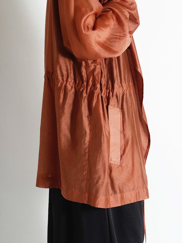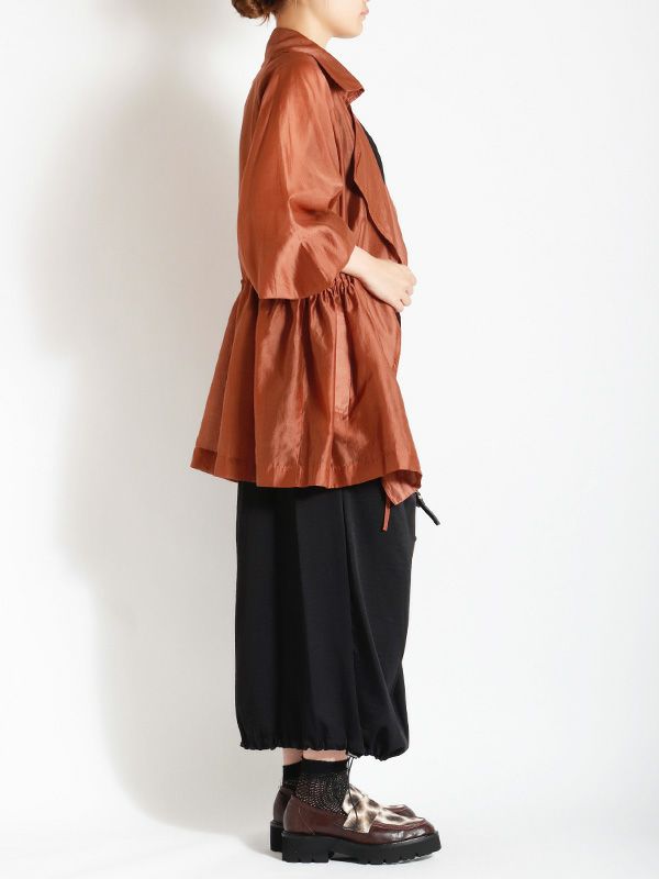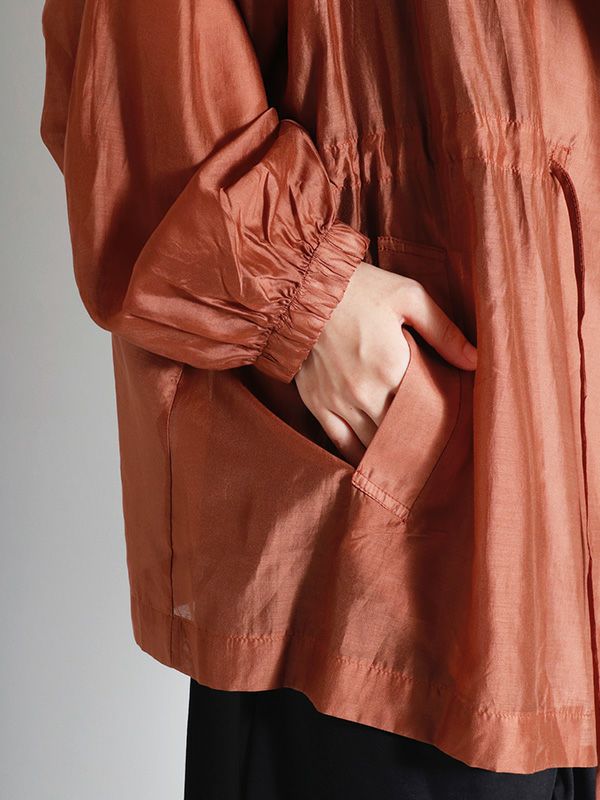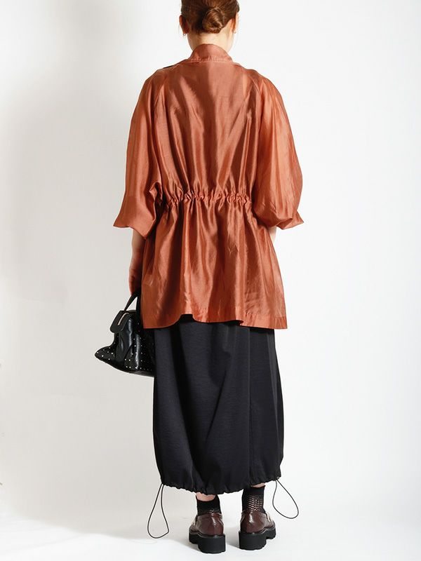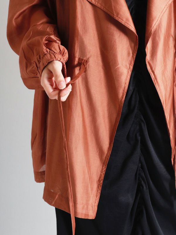 涼しげなシアー素材を使用したショートトレンチデザインのシアージャケット。 程よい透け感と、軽やかな着心地です。ウエストにドロストでシルエットを調整できるディテールを入れて、メリハリのある着こなしが叶う女性らしいデザインです。どこかセンシュアルな雰囲気で大人っぽいデザインがいつものスタイルに羽織るだけで、ジャケットスタイルをトレンドライクに格上げしてくれます。 スカートにもパンツにも合わせやすく、様々なテイストの着こなしにマッチするジャケットです。