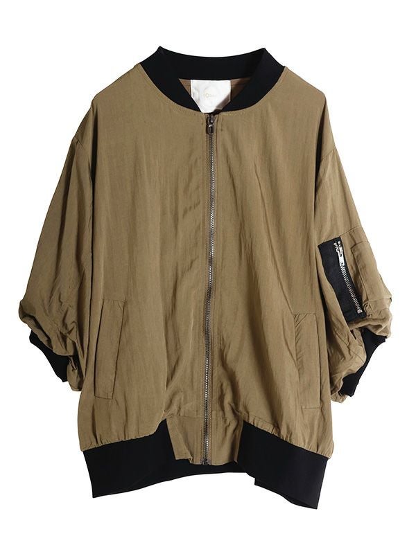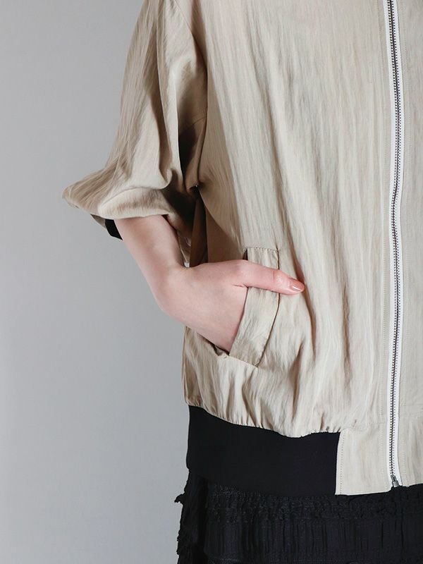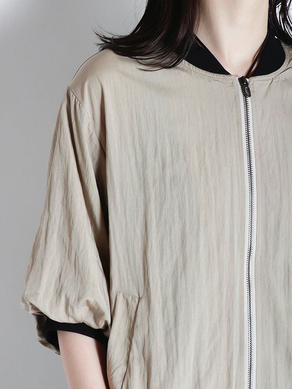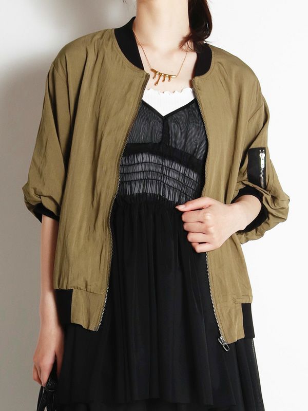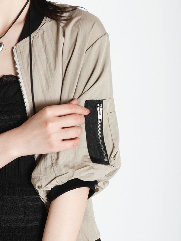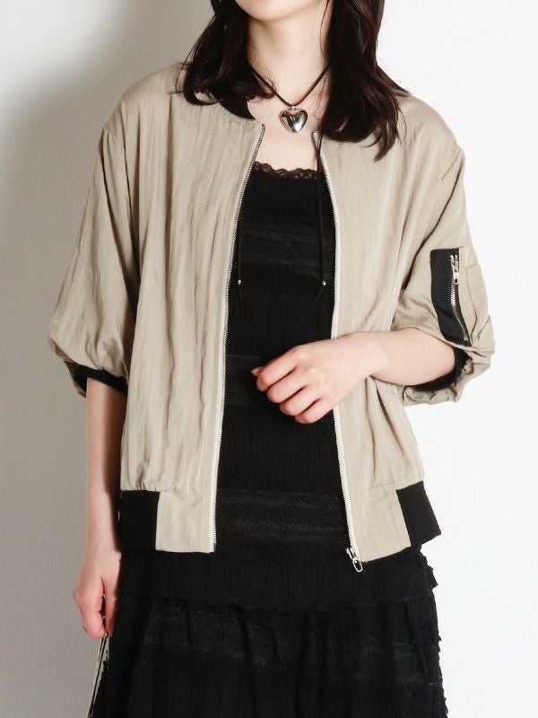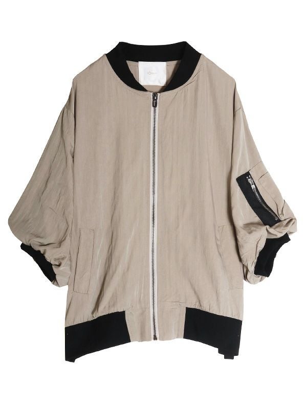 MA-1のディテールに、バルーンデザインの5分袖がカジュアルな中にも女性らしさを演出するブルゾン。メリハリを生む配色のリブ使いがオシャレ感をプラスしてくれます。コンパクトなシルエットながら、ゆったりとした着心地でデニムに合わせてカジュルにはもちろん、ワンピースやロングスカートに羽織ったバランスがおすすめです。これからのシーズン、日除けや室内での体温調整に軽く羽織るのもおすすめのブルゾンです。