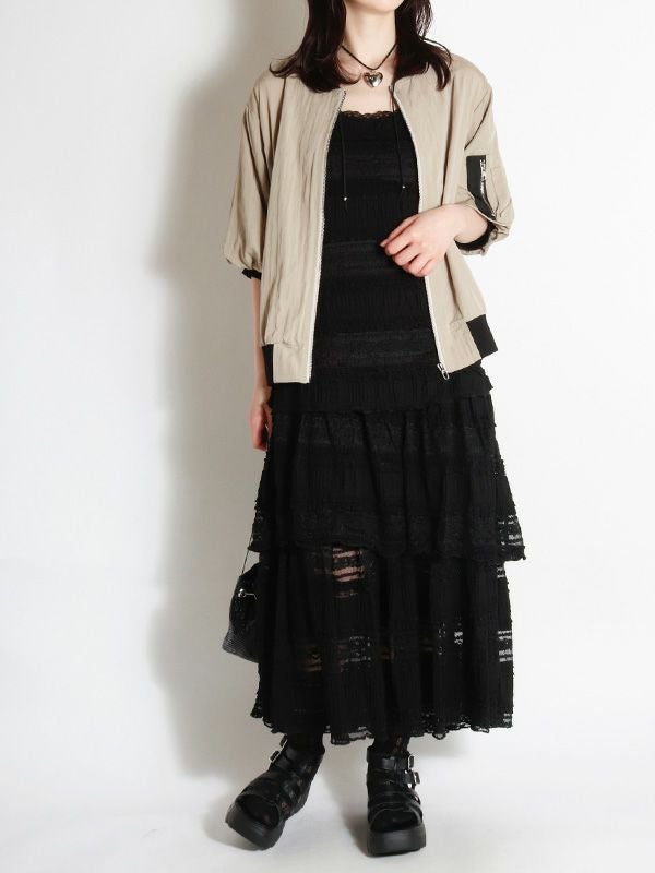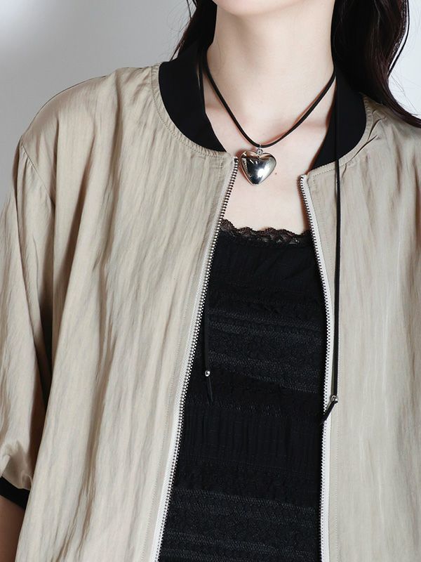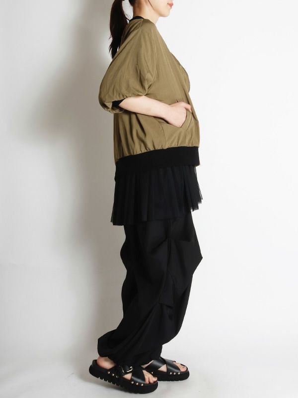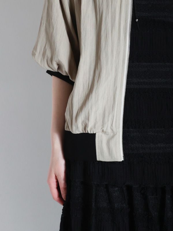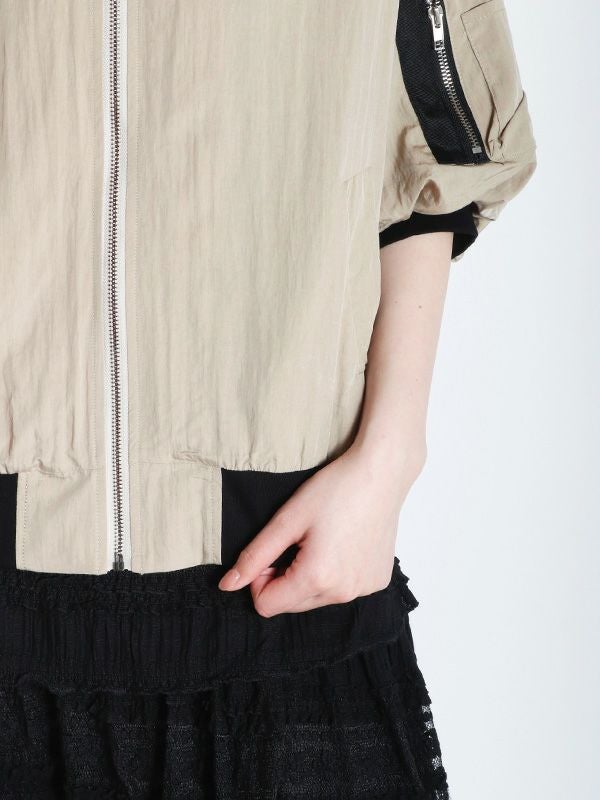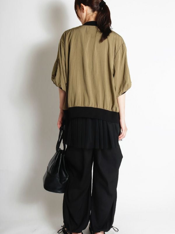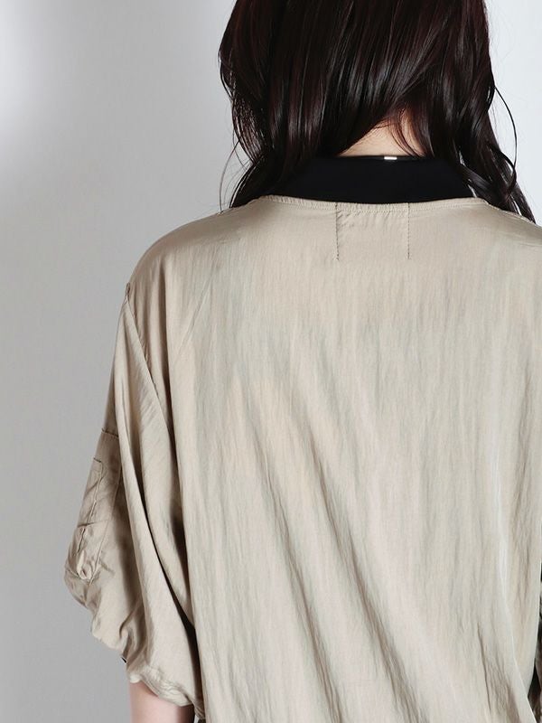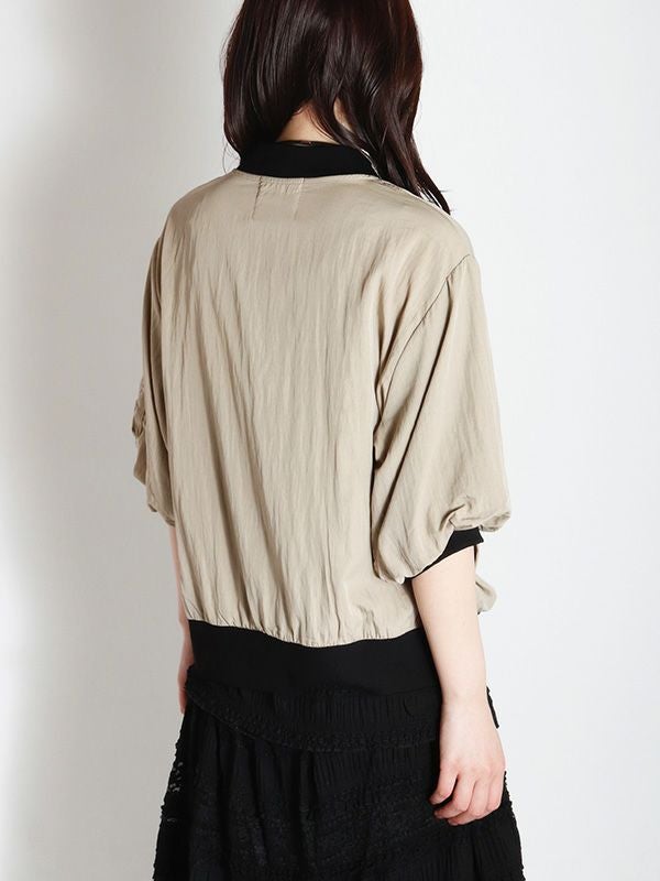 MA-1のディテールに、バルーンデザインの5分袖がカジュアルな中にも女性らしさを演出するブルゾン。メリハリを生む配色のリブ使いがオシャレ感をプラスしてくれます。コンパクトなシルエットながら、ゆったりとした着心地でデニムに合わせてカジュルにはもちろん、ワンピースやロングスカートに羽織ったバランスがおすすめです。これからのシーズン、日除けや室内での体温調整に軽く羽織るのもおすすめのブルゾンです。
