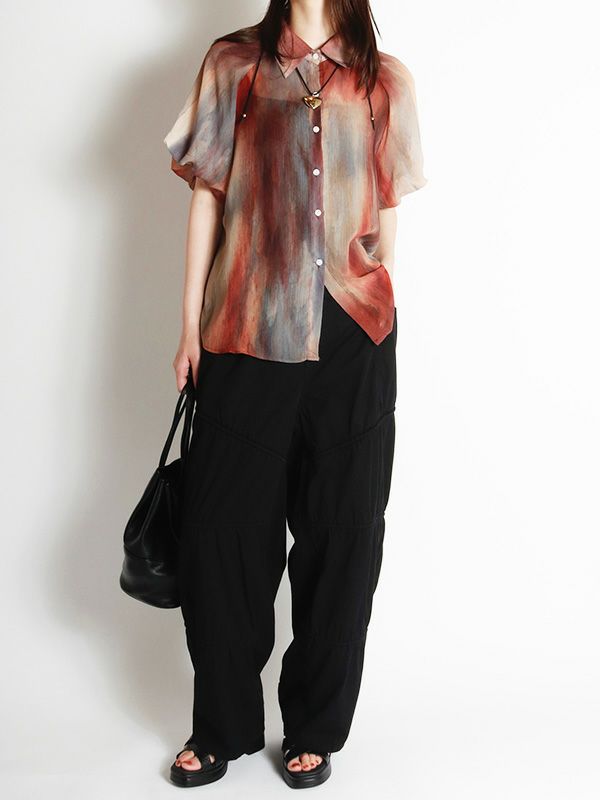 レトロな雰囲気のオンブレプリントのブラウス。袖のバルーンスリーブのディティールがさりげないポイントに。首元はシャツカラーでスッキリと仕上げ甘辛バランスに仕上げました。ボトムスインもアウトも可能で幅広いスタイリングにマッチ。レディなスカートからきれいめワイドパンツ、サロペットやジャンパースカートのインナーにと様々なシーンで存在感を放ちます。デニムパンツにさらりと合わせたカジュアルコーデもおすすめです。