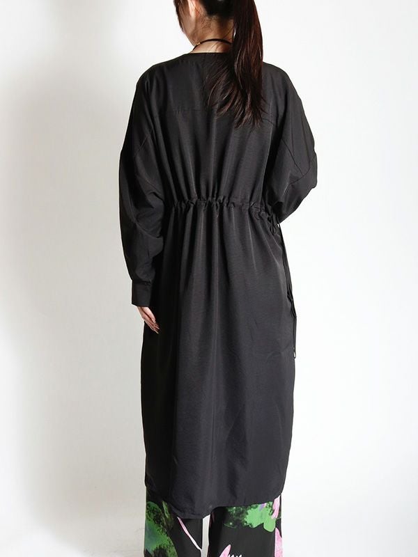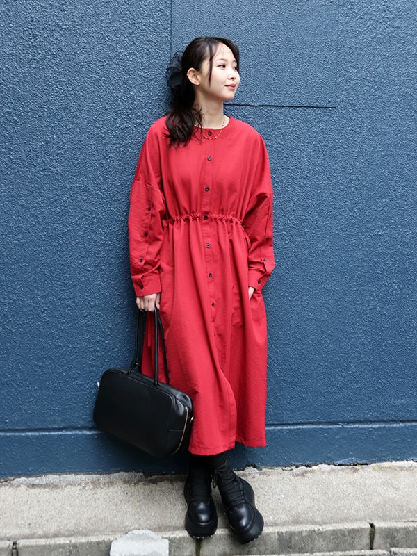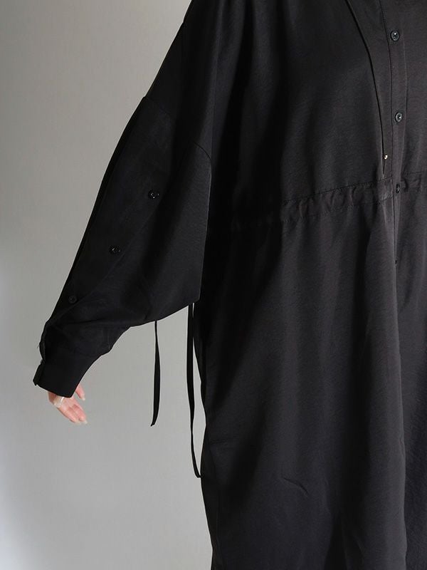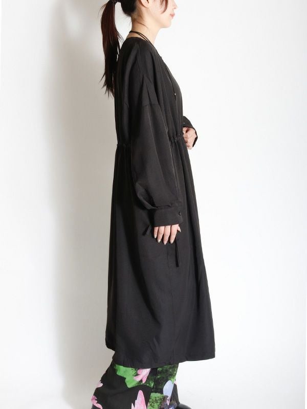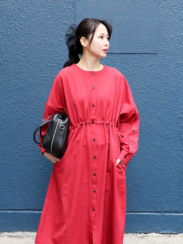 ウエストに施したドロストのディティールがポイントのワンピース。シルエットの調節が可能で自然なウエストシェイプを生み出し、洗練されたシルエットが女性らしさを引き立てます。前立てと袖口にボタンをあしらい、デザインのアクセントに。落ち感のあるエレガントなシルエットで1着でさらりと着るだけで様になります。シンプルな中に光るディティールが、着こなしをワンランク上に格上げしてくれるワンピースです。
