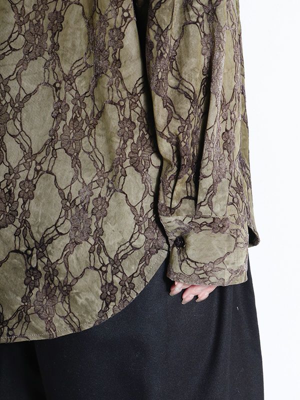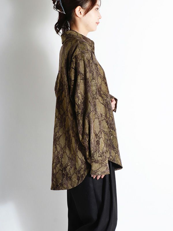 ベルベット調の大胆なフロッキープリントが印象的なシャツ。起毛した質感のベルベット調のボタニカル柄をシャツ全体にプリント。さりげない光沢感も併せてどこか懐かしく上品な大人っぽさを演出してくれます。落ち感のあるポリエステル素材の身生地でシワになりづらいのもポイント。全体的にゆとりを持たせたオーバーなサイズ感は羽織りとしてもサラッと着やすく、抜け感のあるスタイリングを叶えます。
