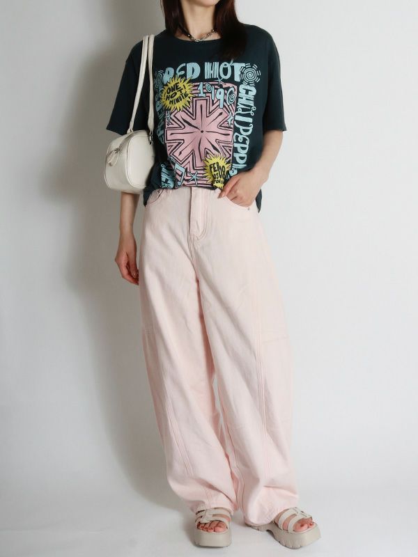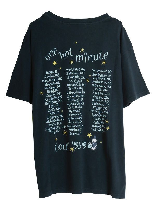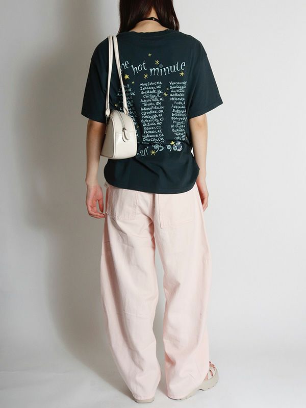 『ワン・ホット・ミニット - One Hot Minute』/レッド・ホット・チリ・ペッパーズの6枚目のアルバムを掲げたワールドツアーをフィーチャーしたグラフィック。バンドのシンボルアイコンをトレンド感のあるパウダーカラーでプリント。DAYDREAMERならではの染色加工、ユーズド感のあるブラックカラー、大胆なプリントを施したバックスタイルもオシャレにキマります。程よく軽い素材でドレープが出る質感と、ルーズな抜け感が出るように柔らかな肌触りで独特の風合いに仕上げたTシャツです。