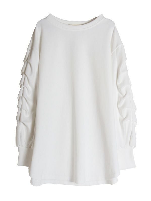 タックデザインがポイントのトップス。袖にたっぷりとタックを施し、カフスボタンを付け、両脇裾にスリットを入れて、ラフな印象のロンTにデザイン性を持たせたひと品。アウトでもインでも着やすい厚みと丈感で着回し力も抜群です。身頃部分はシンプルなデザインなので、ベストやビスチェ、キャミワンピなどとのレイヤードにもおすすめです。