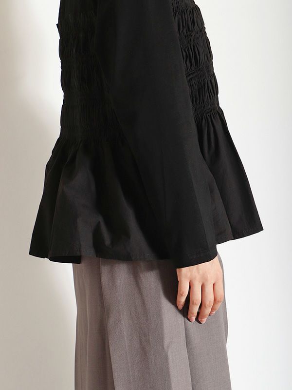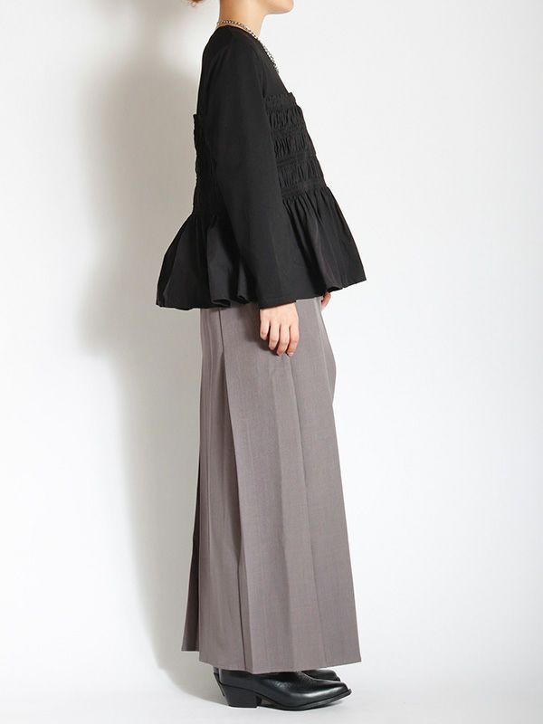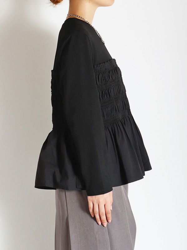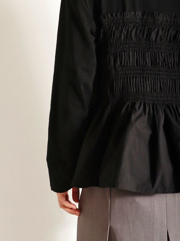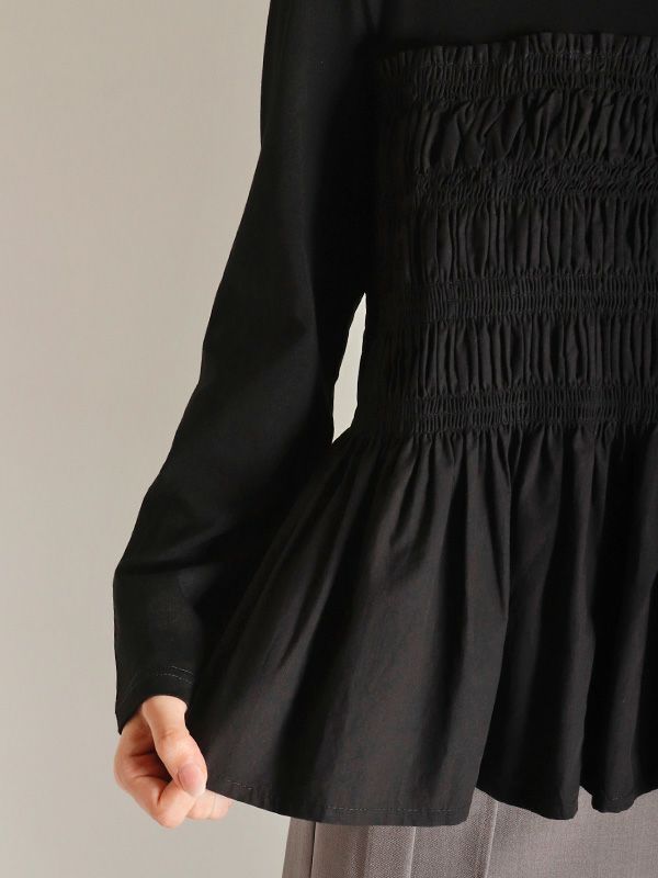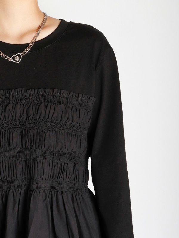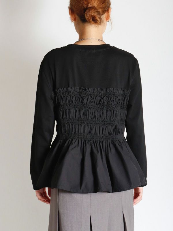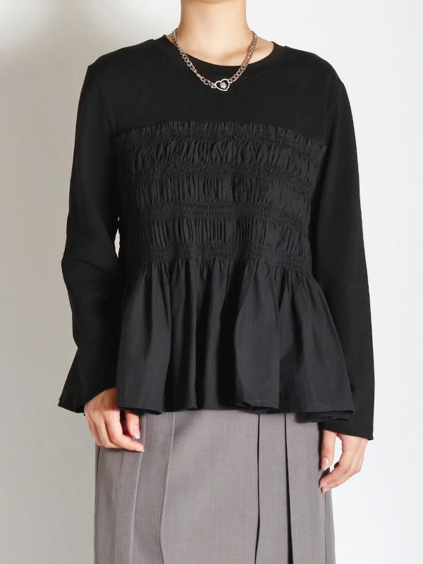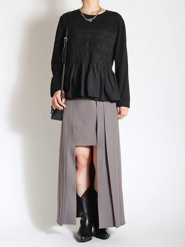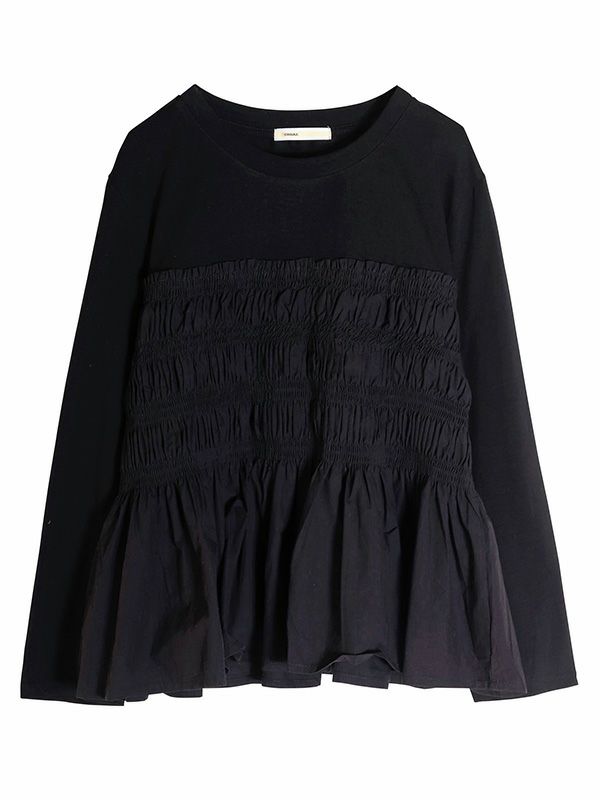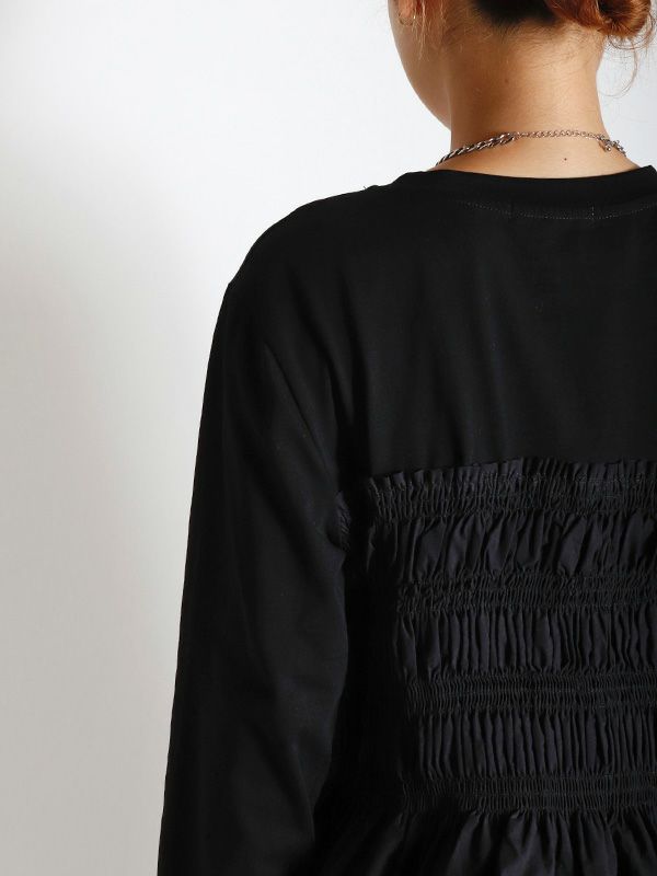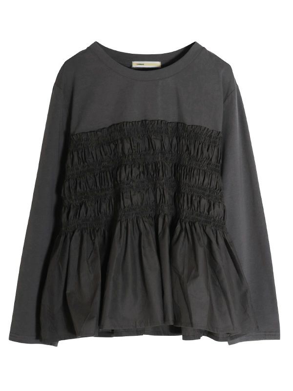 ボリューム感のあるビスチェを重ね着したようなドッキングデザインのロングTシャツ。2種類の素材を組み合わせ、ビスチェ部分を布帛素材にしたことで、ギャザーが細かく綺麗に入っているのがポイントです。ボディーはシンプルにし、甘すぎないデザインに仕上がりました。大人っぽい落ち着いた色味もポイントです。短めの着丈なのでパンツやスカートなど幅広いボトムスと合わせやすいトップスです。