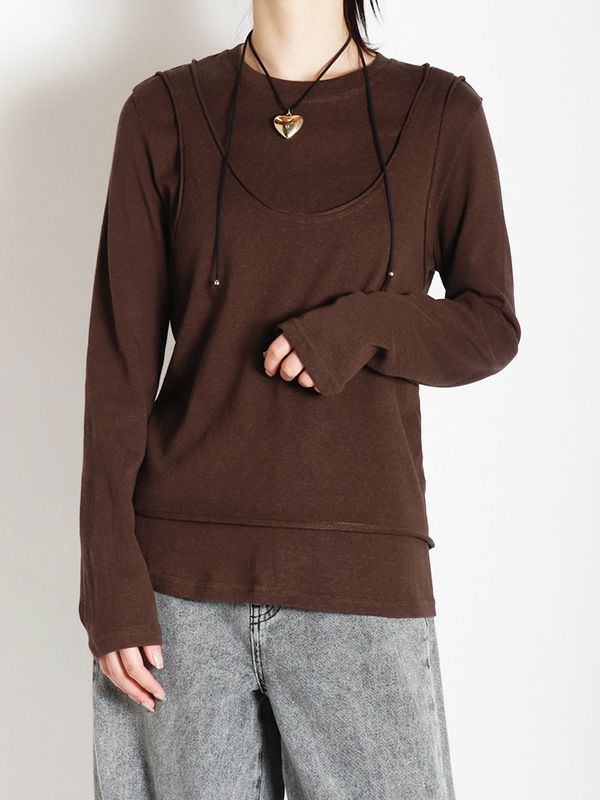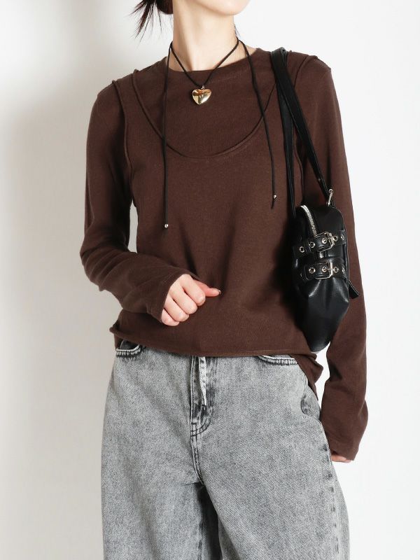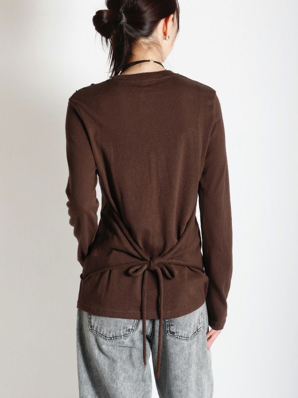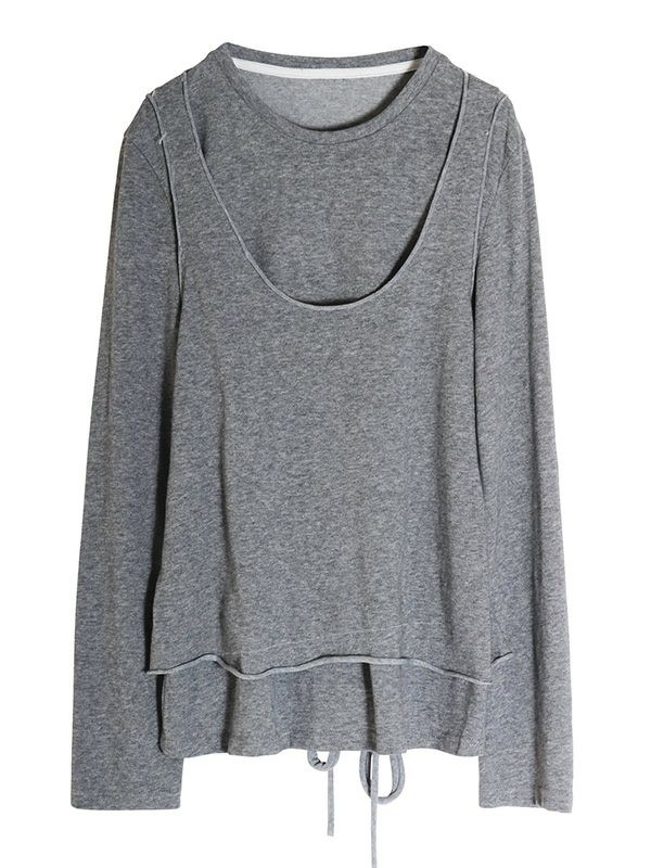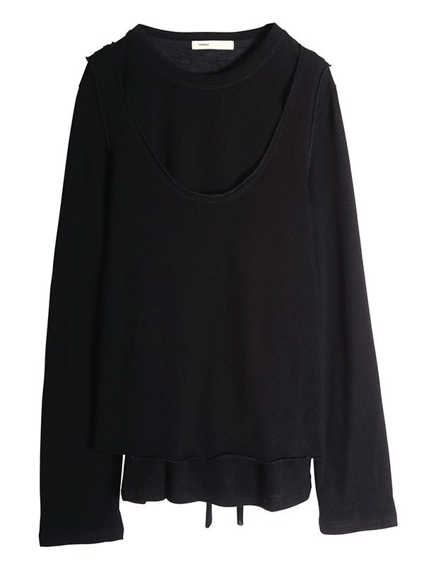 トレンド感のあるレイヤードデザインのプルオーバー。バックリボンのタンクトップを重ねたようなデザインが特徴です。伸縮性のある生地を使用しており、程よく体にフィットするサイジングですが後ろのリボンでシルエットの調整をしていただけます。1枚でもサマになるような仕上がりでワイドスラックスやきれいめパンツと合わせれば、洗練された大人のカジュアルスタイルが楽しめます。