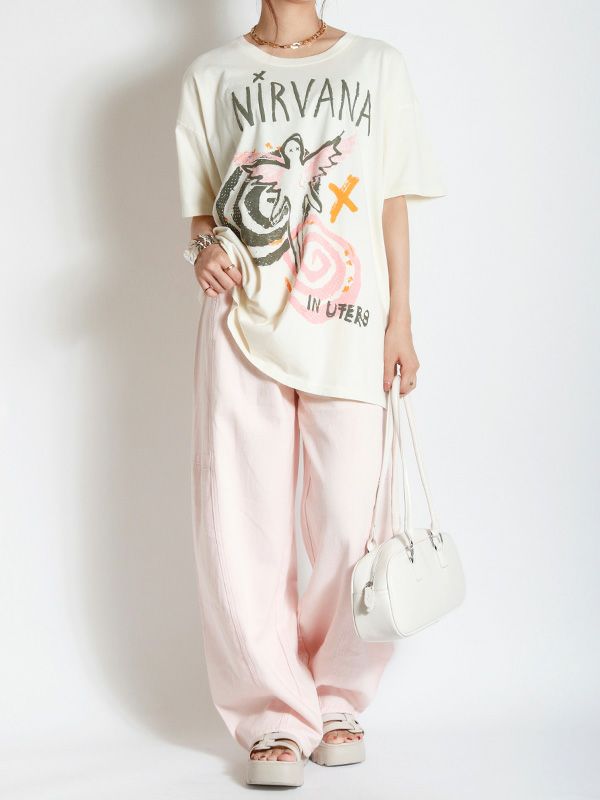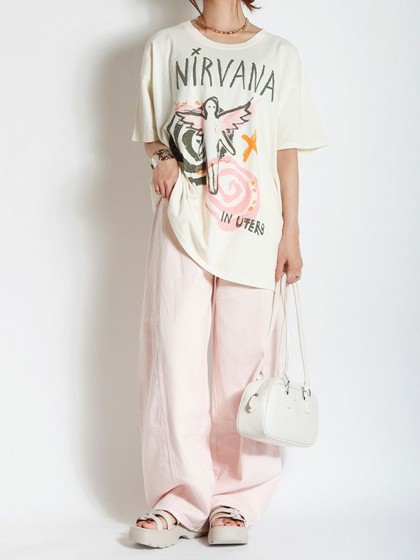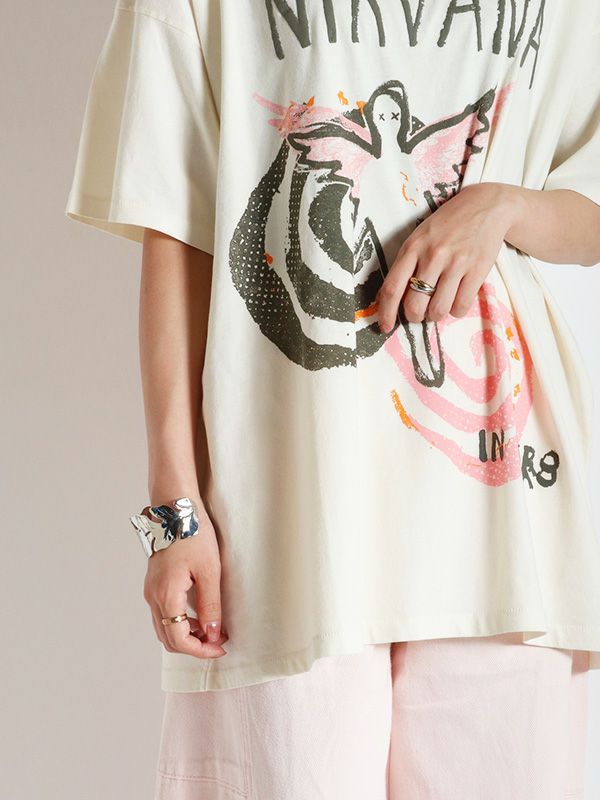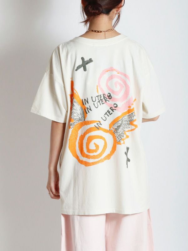 1993年に発売されたNIRVANA/ニルヴァーナのスタジオ・アルバム『IN UTERO/イン・ユーテロ』のジャケットに使われているアート画が、落書きのようにラフに描かれたグラフィックをプリント。ロゴには発砲プリントを施しさり気ないアクセントを添えた仕上がりです。大胆なプリントを施したバックスタイルもオシャレにキマります。スカートでもパンツでも着まわせるアイテム。ルーズな抜け感が出るように、柔らかなコットン100%の肌触りで独特の風合いに仕上げたTシャツです。