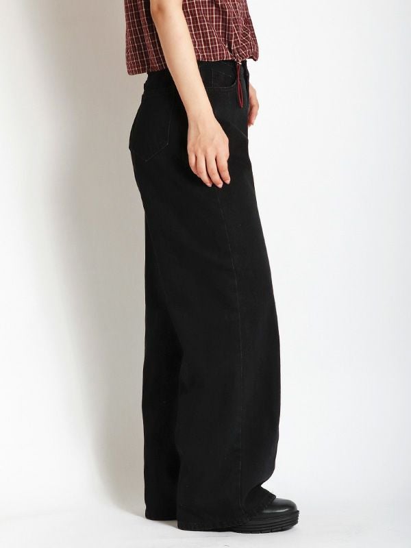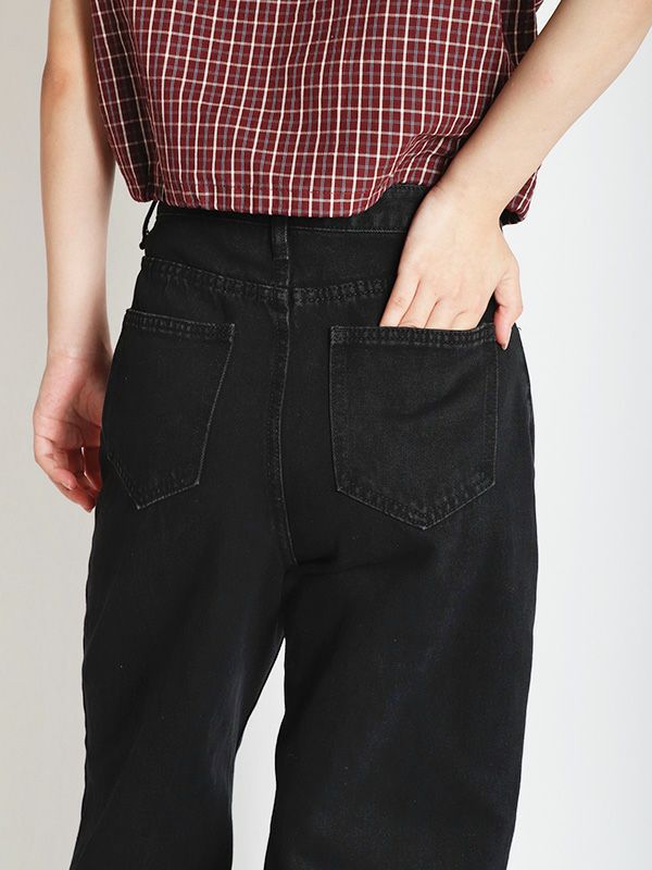 ストンと落ち感のあり、腰回りがもたつかずスッキリ見えるバギーシルエット寄りのワイドストレート。ミッドライズなのでトップスをインしてもバランスが取りやすく、 スタイルアップ効果も期待できます。カジュアルなTシャツやスウェットと合わせる定番スタイルはもちろん、 あえてタイトなトップスやきれいめなシャツと合わせることで、 シルエットの美しさが際立ちます。デニム地感ながらも穿き馴染みも良く、ロングシーズン季節問わず楽しめるデニムです。