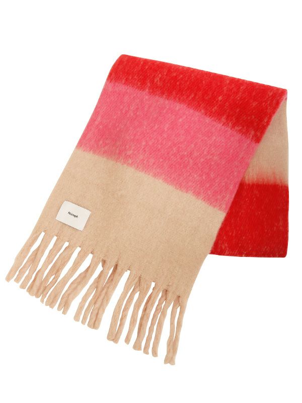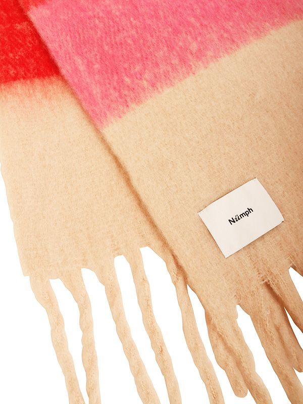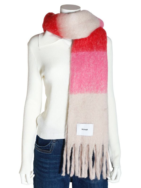 暗くなりがちな冬のコーディネートに華を添えるレッド、ピンクをベースにしたカラフルなチェック柄マフラー。温もりのある素材感で、とても軽くフワフワとした肌触りです。ループ巻きや、首にぐるぐると巻くとボリュームが出ておすすめです。