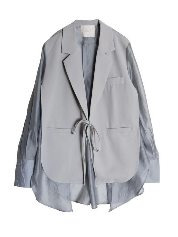 大人気のシアージャケットがバージョンアップ&新色で入荷しました!オーガンジーのシアー感のある素材を使用し、異素材で切り替えた珍しいデザインの変化球ジャケット。フロントのストリングデザインも程よい抜け感をプラスしてくれます。暑くなると質感が気になるジャケットも透け感素材だと重くならないのが◎ オーガンジー素材の張り感があるので形がきれいに出ています。透け感素材なので決まり過ぎず 程良くカジュアルな印象に◎大人女性におすすめのジャケットです。