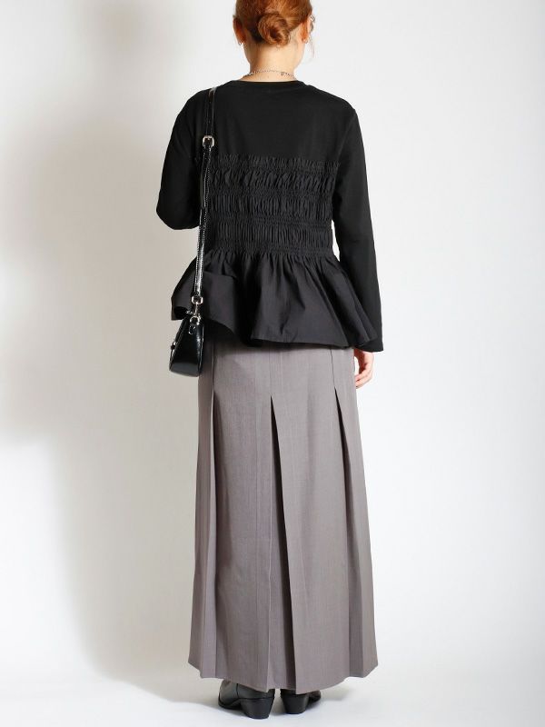 ボリューム感のあるビスチェを重ね着したようなドッキングデザインのロングTシャツ。2種類の素材を組み合わせ、ビスチェ部分を布帛素材にしたことで、ギャザーが細かく綺麗に入っているのがポイントです。ボディーはシンプルにし、甘すぎないデザインに仕上がりました。大人っぽい落ち着いた色味もポイントです。短めの着丈なのでパンツやスカートなど幅広いボトムスと合わせやすいトップスです。