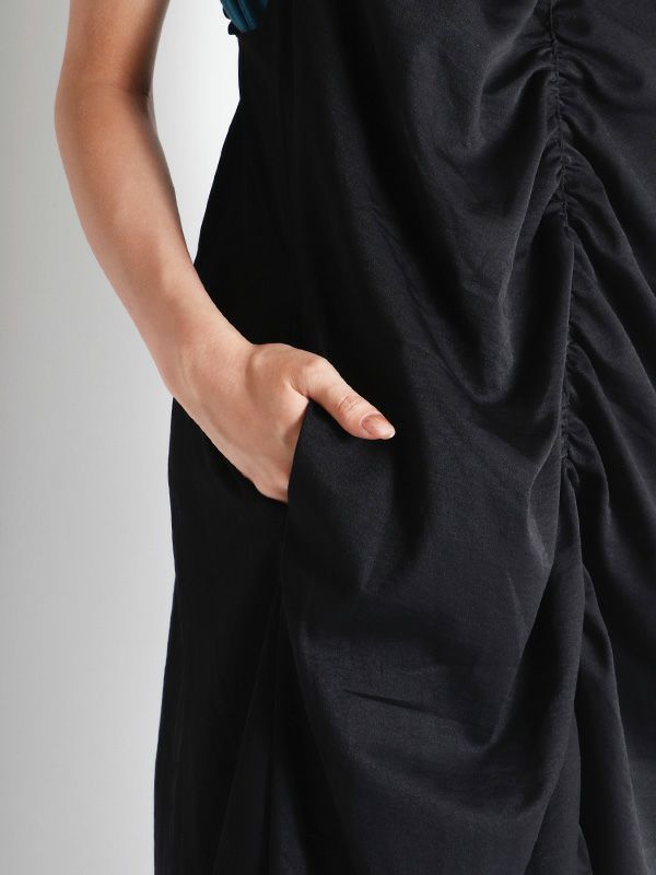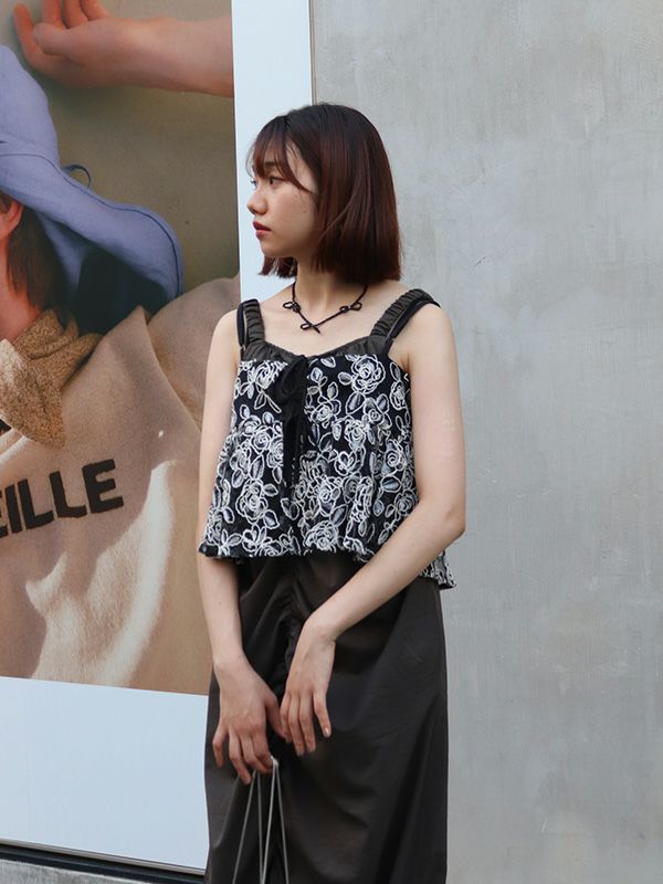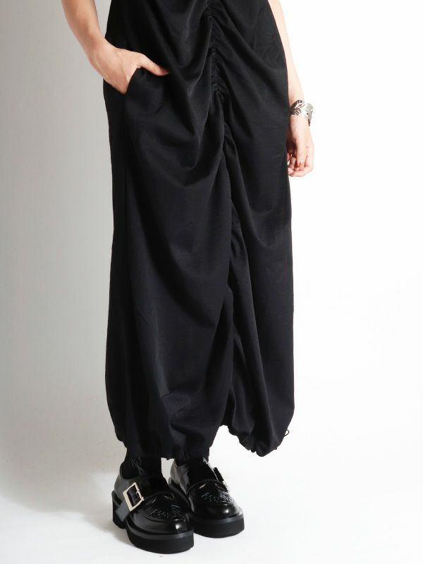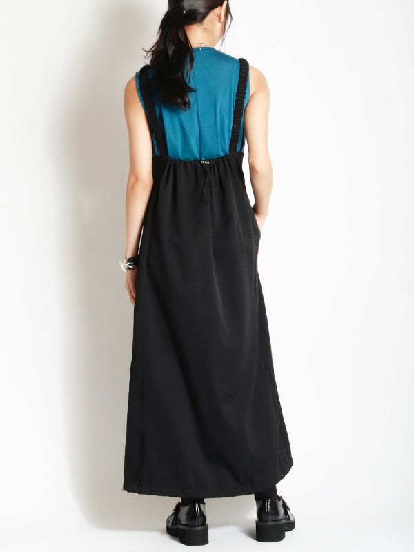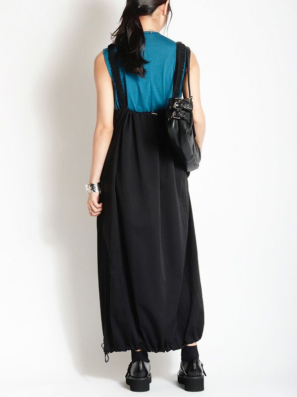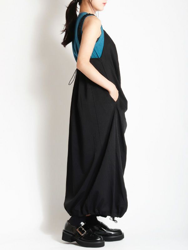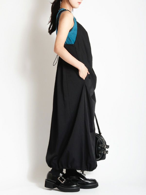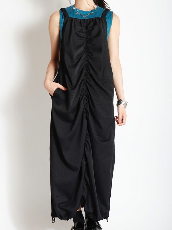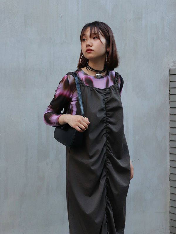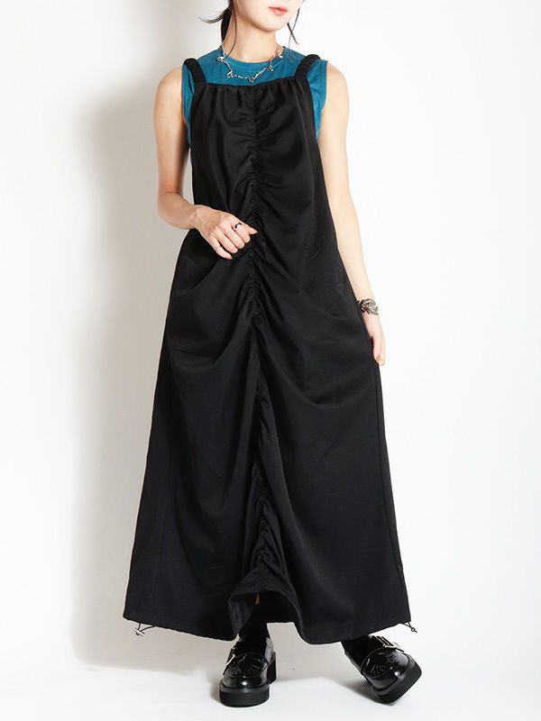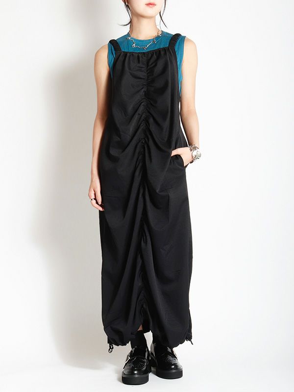 フロントに大胆なシャーリングデザインを施したキャミワンピース。クシュクシュとギャザーを寄せたストラップもさりげないアクセント。裾やバックスタイルはストリングでシルエットの調整ができ、シンプルながらもディティールにこだわったデザインです。ワーク調の雰囲気がありながらもフェミニンなアクセントが絶妙にバランスを取っているのでカジュアル過ぎない印象で着ていただけます。レイヤード次第で着こなしの幅が広がるアイテムです。