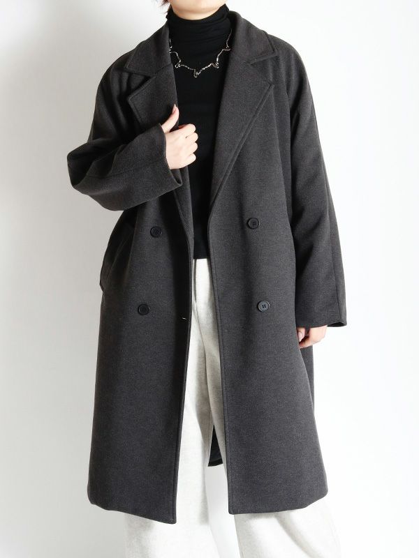 エフォートレスな上品さを纏うダブルのテーラードコート。動きやすさとスッキリとした肩回りで着ていただけるラグランスリーブデザイン。膝にかかるミドル丈が、ボトムスを選ばずさまざまなアイテムと相性抜群です。シンプルながら洗練された佇まいで大人の雰囲気を演出します。ボリュームのあるインナーを合わせても、シルエットが崩れにくい、ゆったりとしたサイズ。幅広いコーディネートにマッチする使い勝手の良いデザインです。