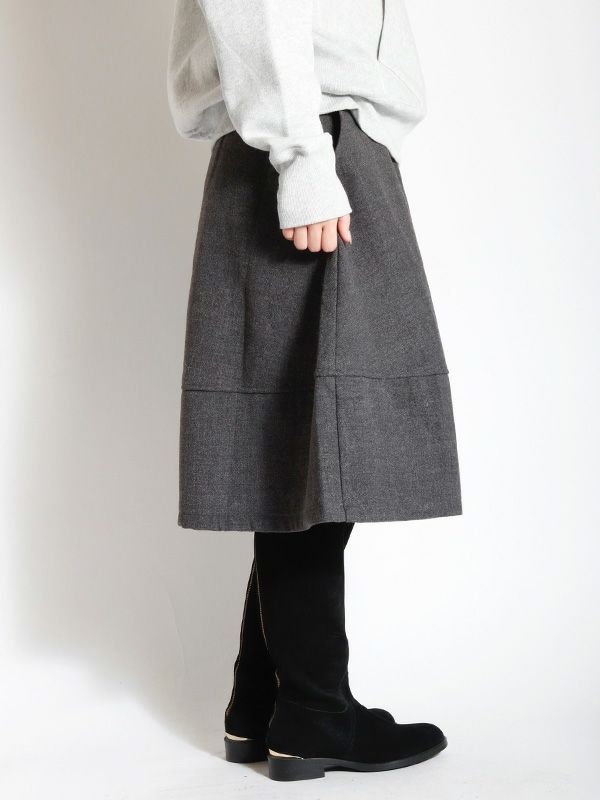 深めのタックと裾に切り替えを施したコクーンシルエットが、立体的で優雅なフォルムを描くスカート。一見シンプルですが特徴的なシルエットのスカートなのでシンプルなトップスとも好相性。後ろウエストゴムでリラックスした履き心地です。ボリュームのあるシルエットですがウエスト部分はすっきりと見える設定。トップスをインしてもアウトでもバランス良く決まります。足元にブーツを合わせれば、モード感と上品さを兼ね備えた大人のスタイルが完成します。
