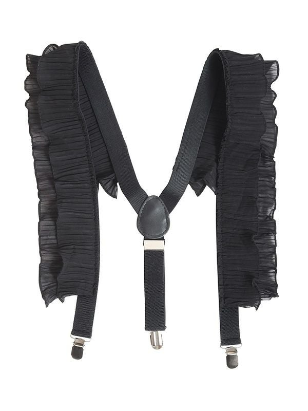 フリルを施したY型サスペンダー。クリップタイプなので様々なボトムとのコーディネートが可能です。今季のトレンドのシアーなフェミニンスタイルやカジュアルスタイルのアクセントにプラスしたいひと品です。