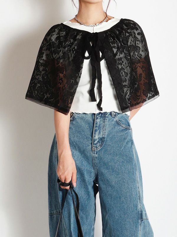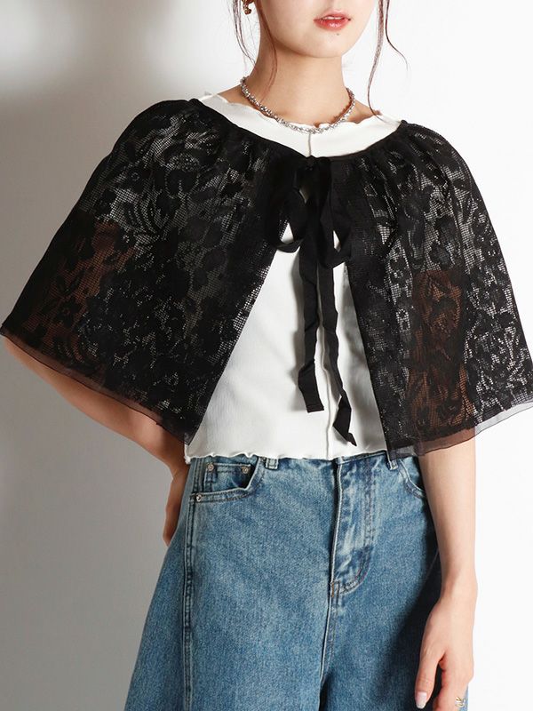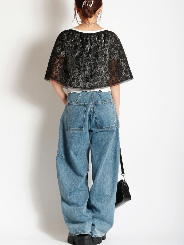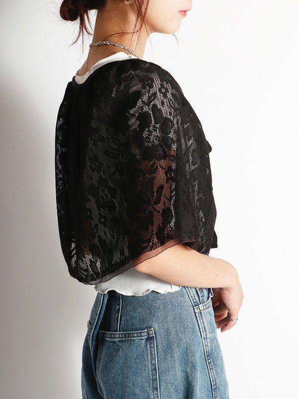 レース生地を使い、ギャザーがたっぷり入ったレースカラー。ケープ見えするほどのビッグカラーとしてはもちろん、腰に巻いてレイヤード用のミニスカートとしても、とっても可愛いアイテム。工夫次第で様々なスタイルをお楽しみいただけます。