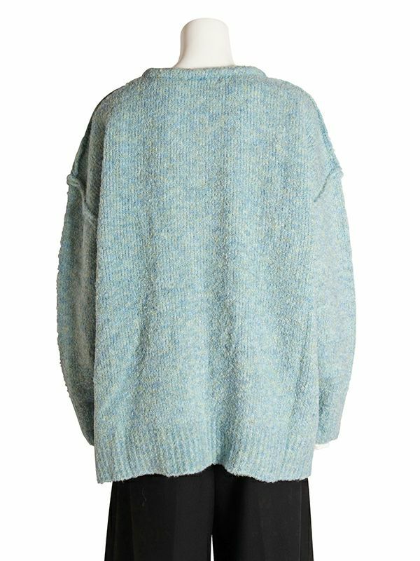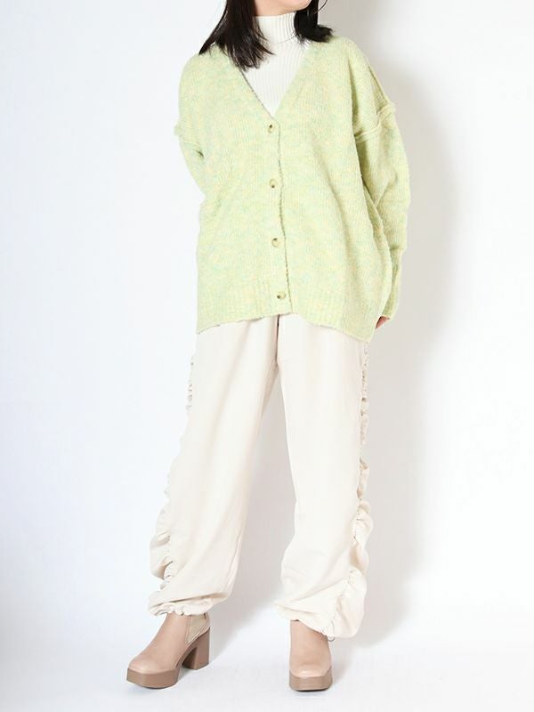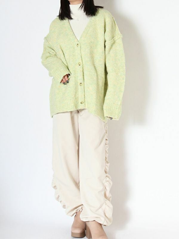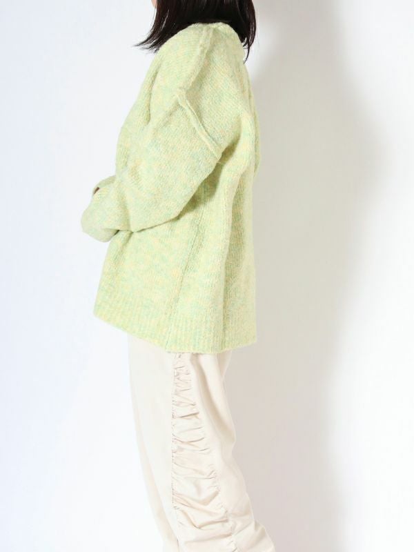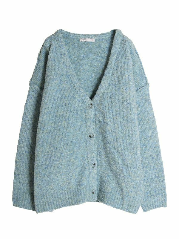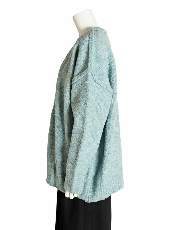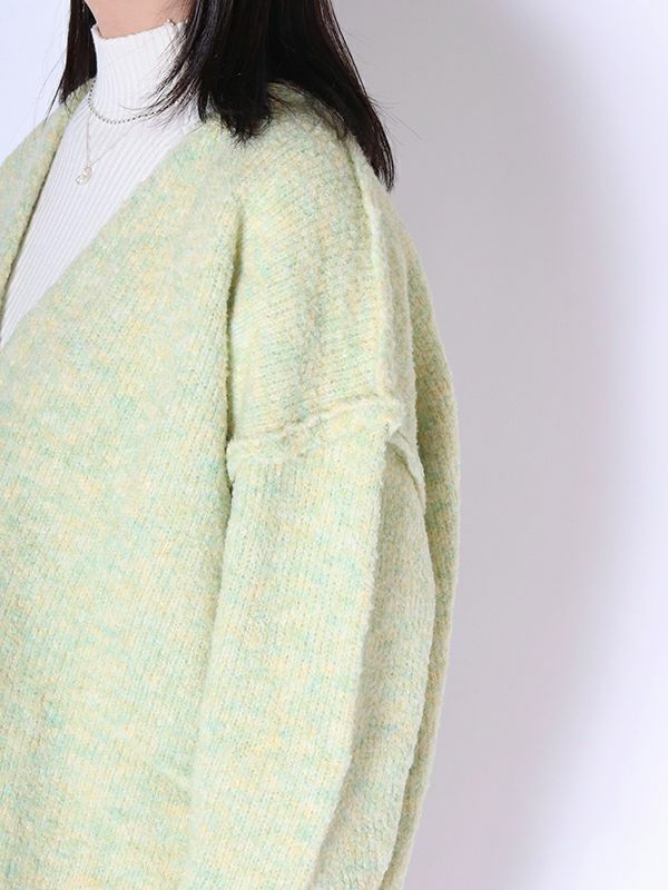 ニュアンスなMIXカラーの糸が魅力的なビッグカーディガン。編みで肉感をもたせ、起毛がかかりふっくらと仕上がった1枚です。腰あたりまである長めの着丈なので、ワンピースやロングスカートでもバランスよく着られます。首回りは深めなVネックですがプルオーバーとしての着こなしもおすすめです。春先にも楽しめるようなカラーリングでユルッとラフに着て頂けるカーディガンです。