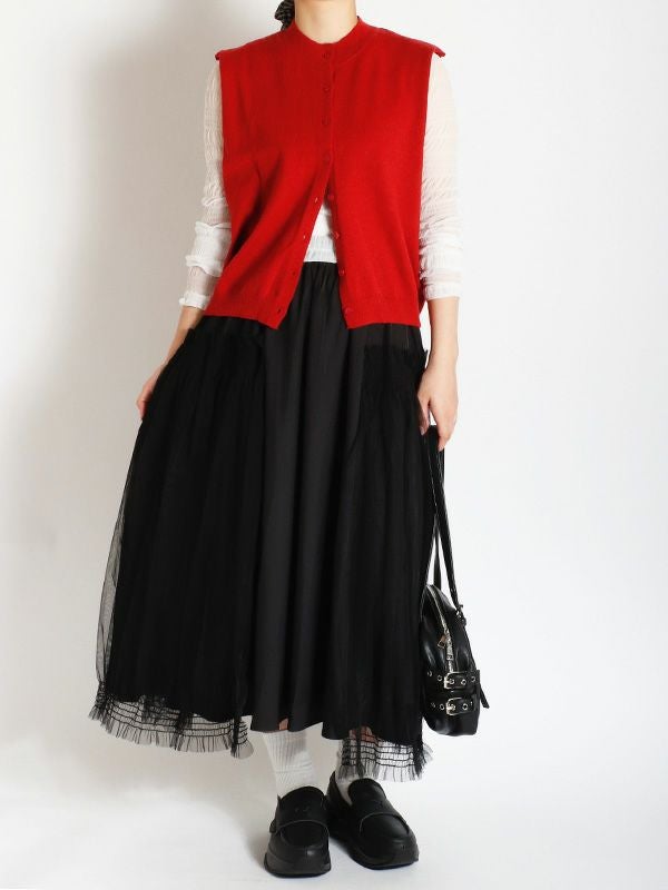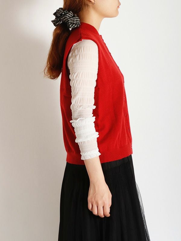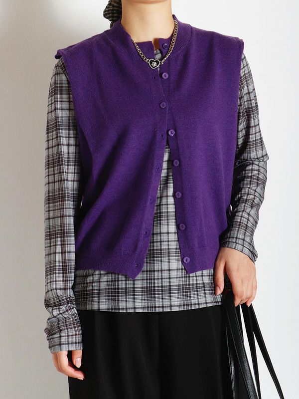 ハイゲージの編地をあえて毛羽立ちのある表面感に仕上げることで、甘すぎない大人の上品さを表現したニットベスト。シンプルなTシャツやブラウスに重ねるだけで、いつものコーディネートをワンランクアップ。デニムと合わせてカジュアルダウンしたり、きれいめなパンツやスカートと合わせてフェミニンなスタイルにも◎。ワンピースの上からレイヤードするのもおすすめです。