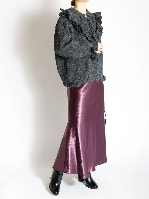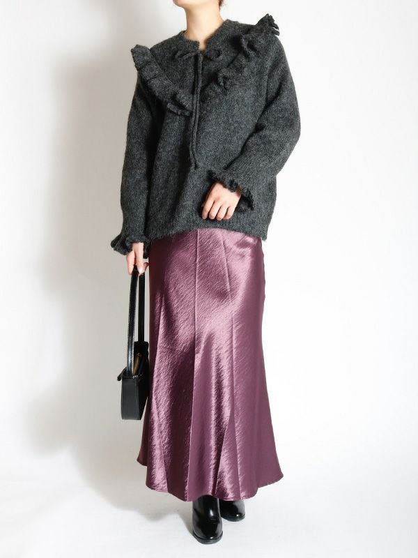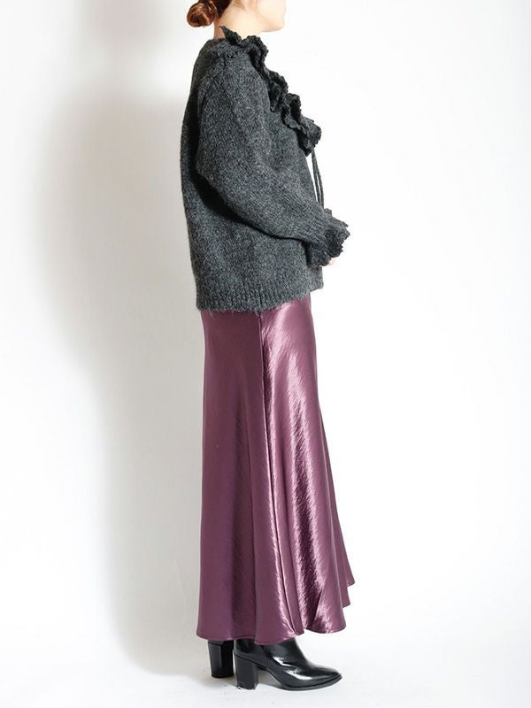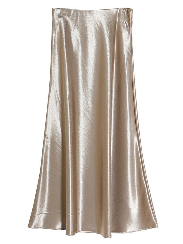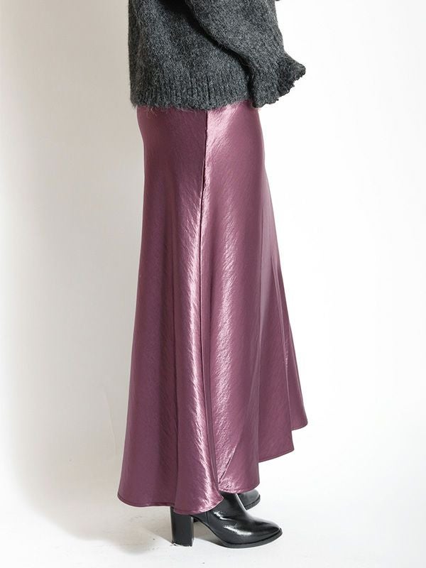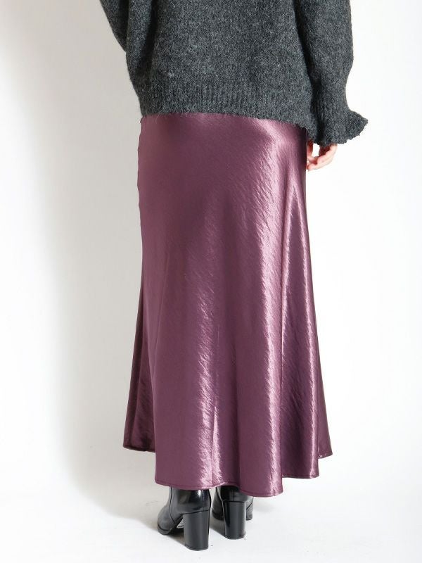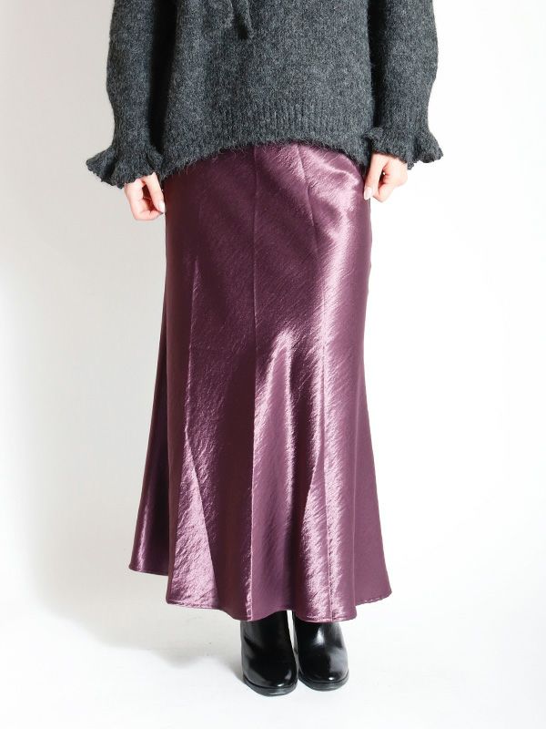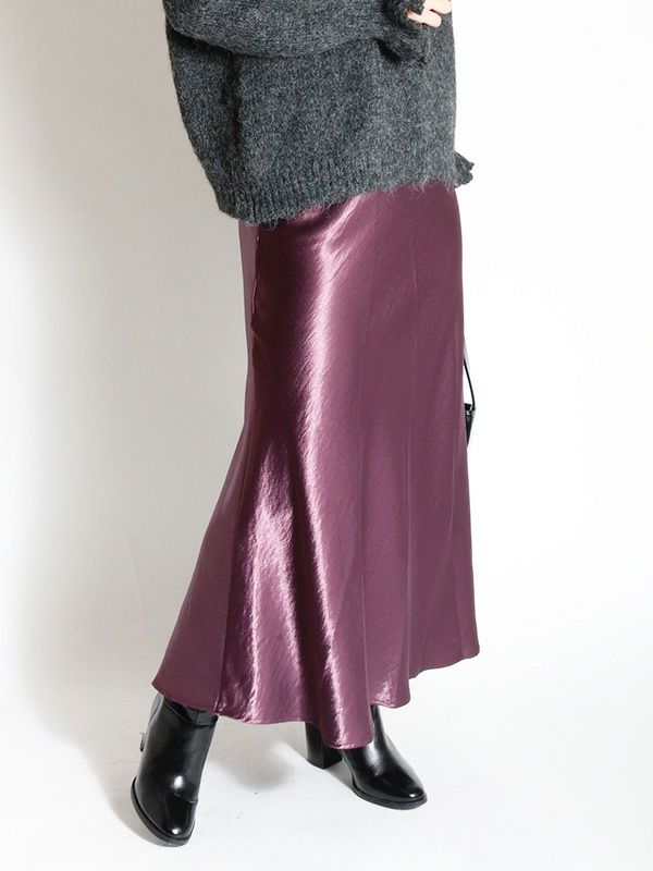 サテン特有の光沢感と差し色になるようなカラーリングが特徴のマーメイドスカート。バイアスで裁断をしているため、細身でありながら着用感も締め付けがなく、足さばきも良いのがポイント。きちんと感のあるデザインながらも、てろっとした落ち感が心地よく、ウエストゴムでストレスフリーな着心地にこだわったひと品。ざっくりニットを重ねたリラックスコーデやフェミニンなキレイめコーデまで。スウェットやオーバーシャツとも好相性のスカートです!