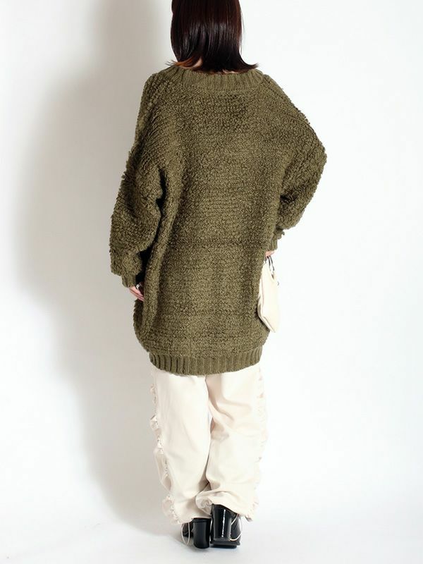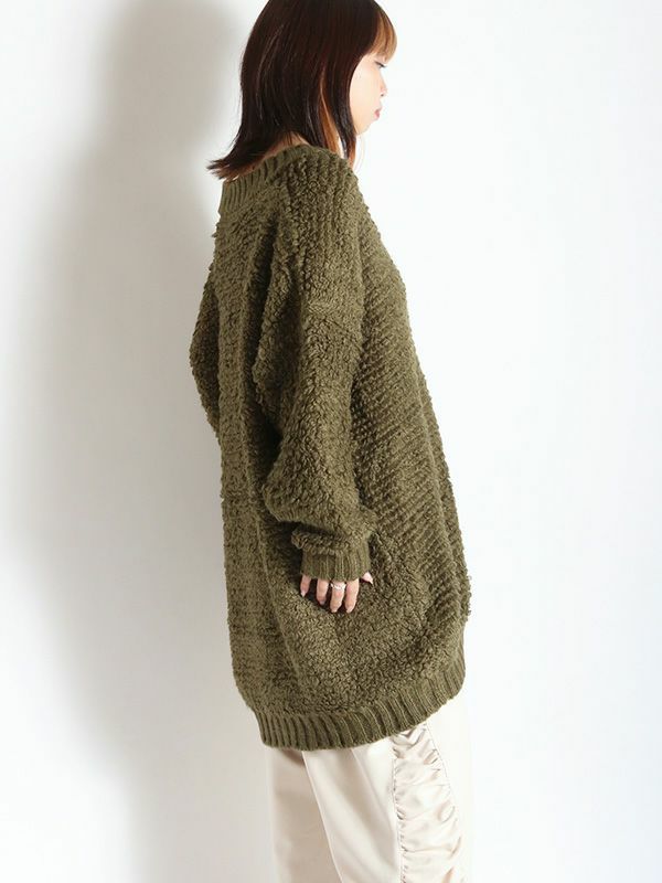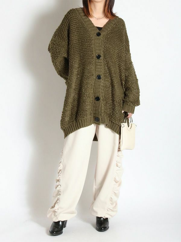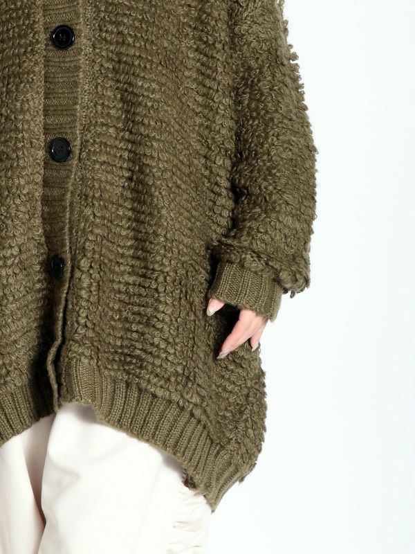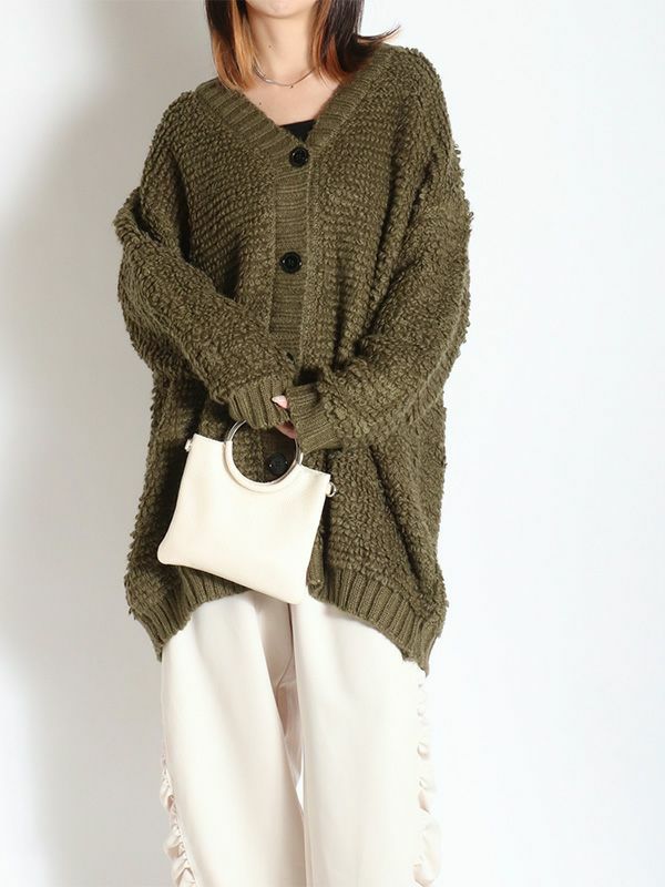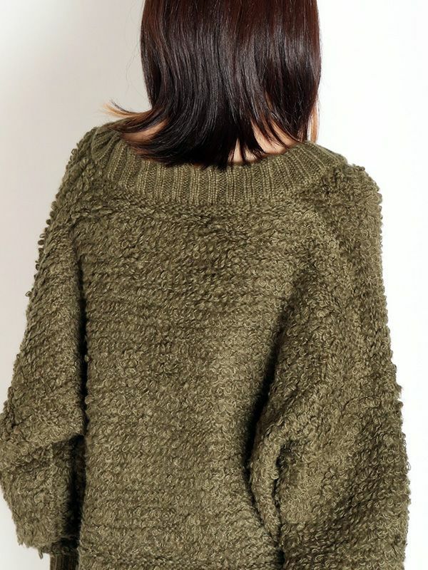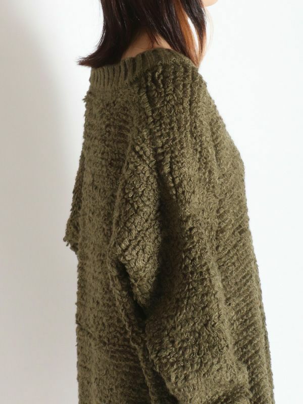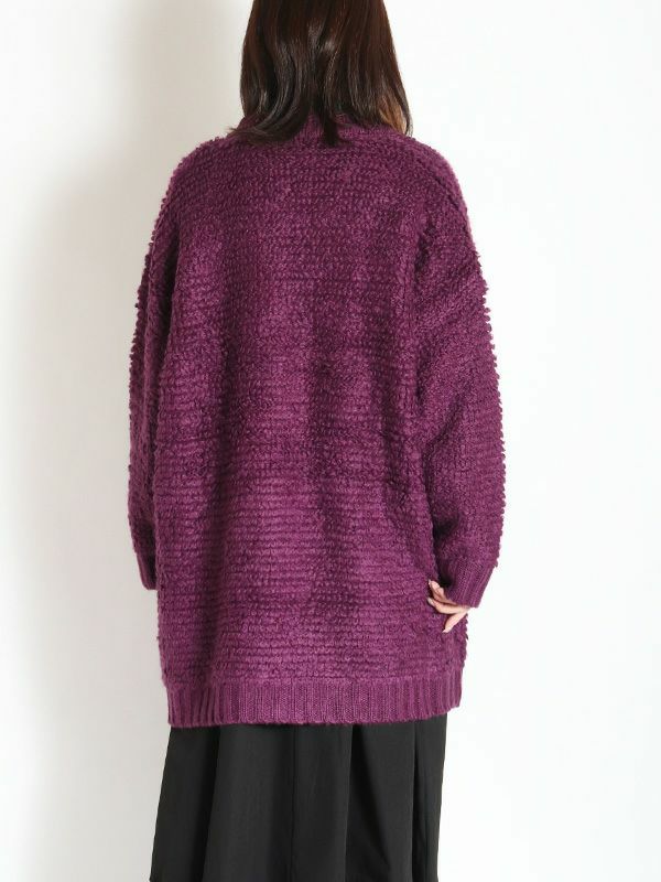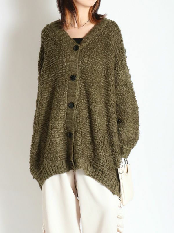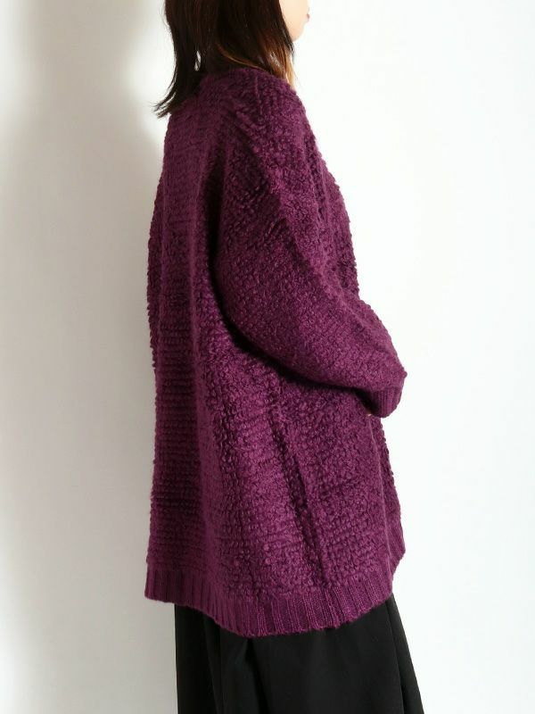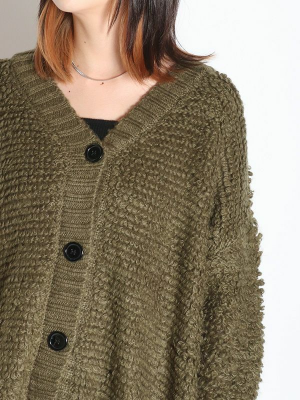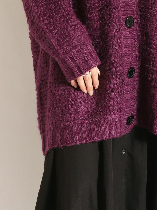 ループ状のブークレ糸を編んだ編地が特徴のカーディガン。しっかりと編まれていてややゆったり目のオーバーサイズシルエットなのでアウターのように着用することも可能です。おしりをすっぽり覆ってくれる安心の丈感でコーディネートに取り入れやすいデザインです。大きなボタンもポイントです。スッキリとクールで着回し力抜群のブラック、柔らかい印象のカーキ、コーデに華を添えるアクセントカラーのパープルの3色展開です。