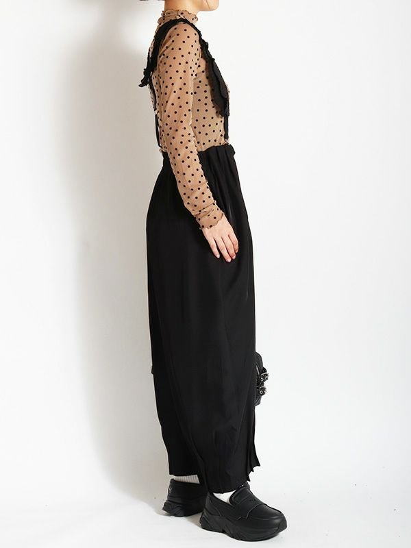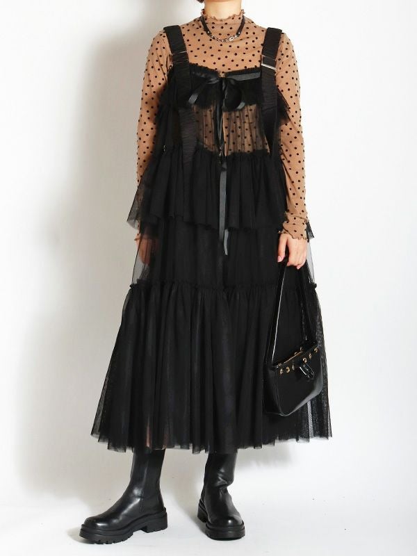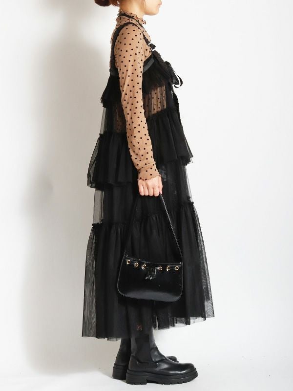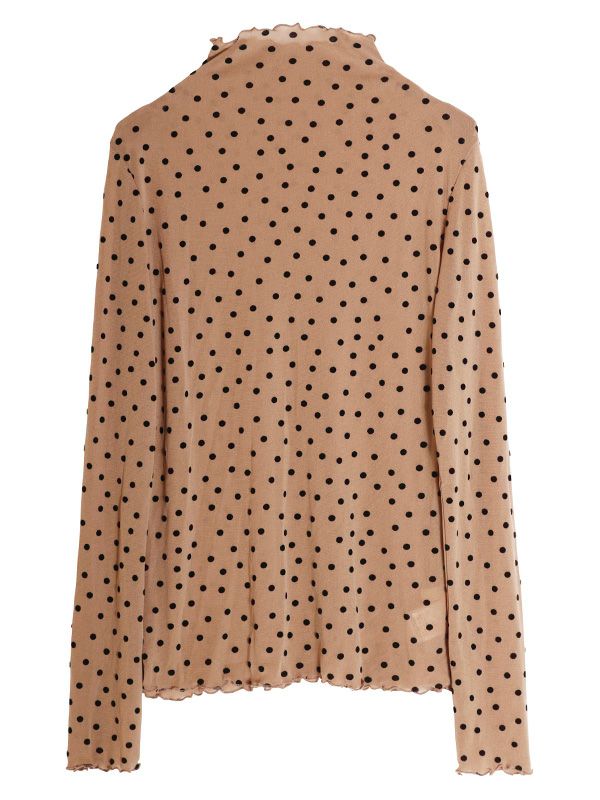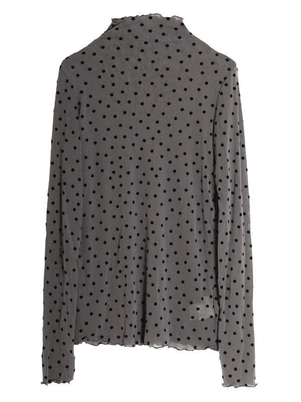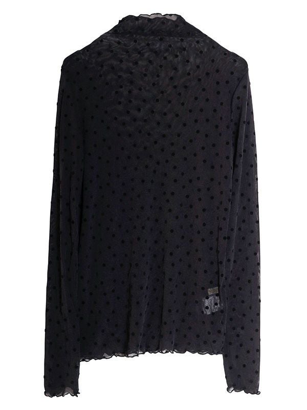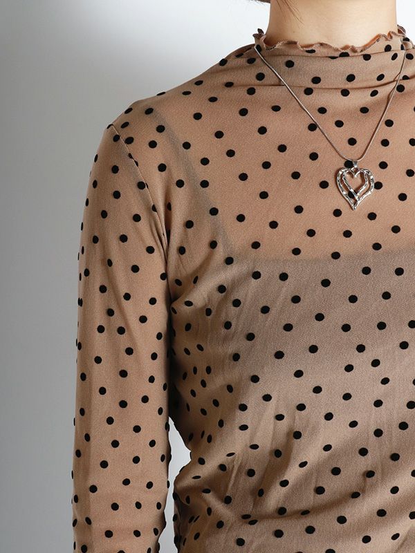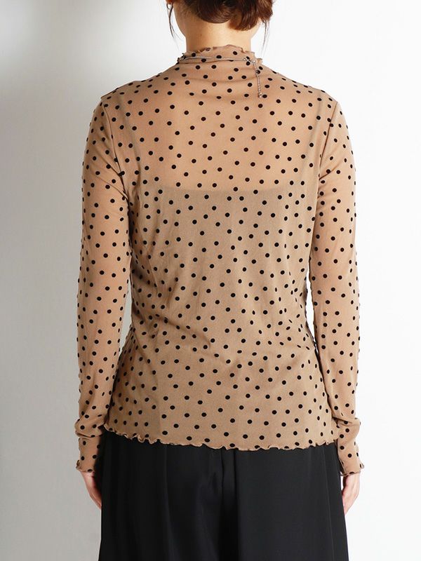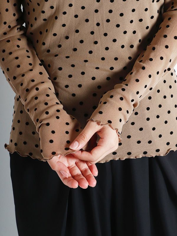 ドット柄のフロッキープリントが特徴のシアートップス。袖の細身シルエットにこだわり、すっきりとしたシルエットにしたことで、体のラインにきれいに沿います。袖も細身なので、重ね着してももたつかずに着こなせて◎。ハイネックの襟ぐりは、1枚ではもちろんレイヤードスタイルなど着こなしを楽しんでいただけます。無地のニットやスウェットの襟や袖口から少し覗かせたスタイリングもおススメです。