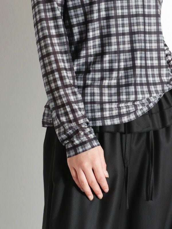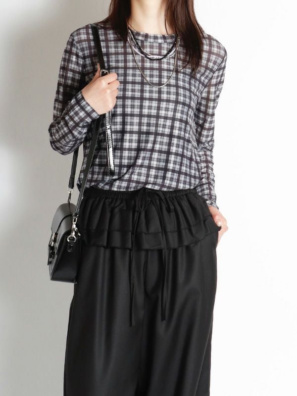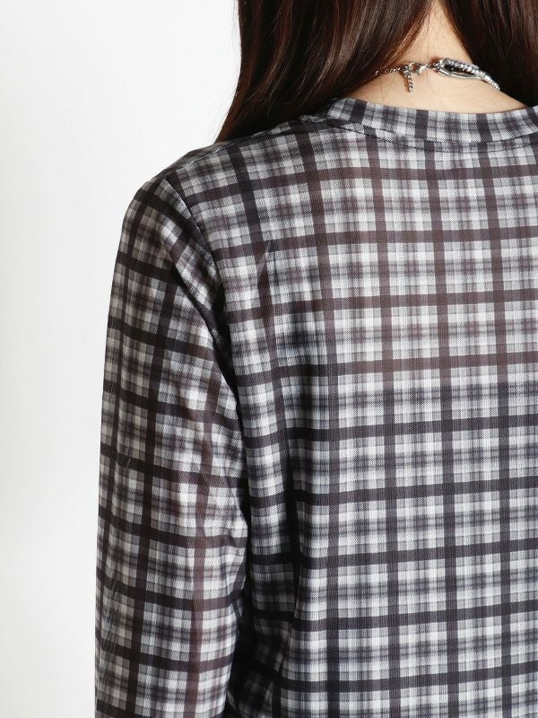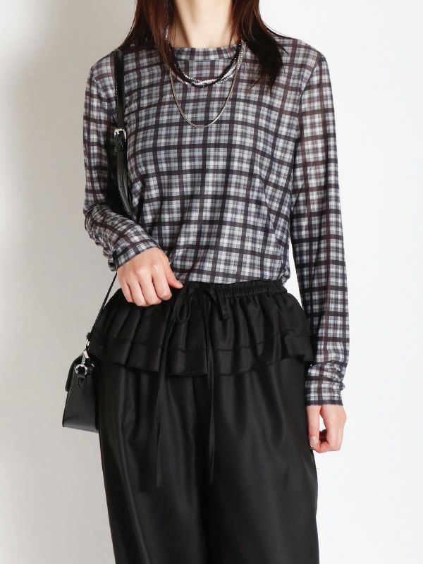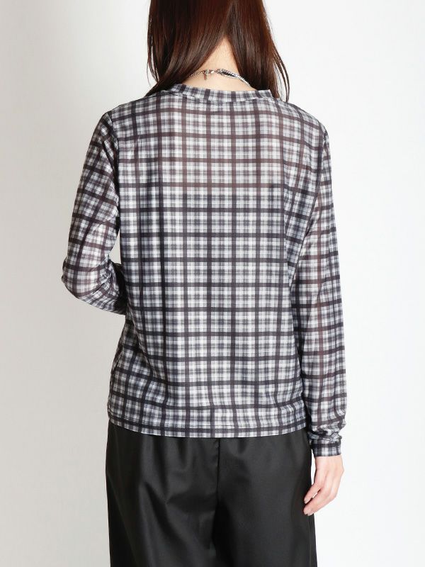 スタイリングの幅が広がるシアートップス。落ち着いたカラーリングのブラックとアクセントになるブラウンの2色のチェック柄でコーディネートに取り入れやすく、これからの季節にピッタリ。程よくフィット感のあるシルエットで体のラインにきれいに沿います。レイヤードアイテムとしても重宝しスタイリングのアクセントとしてロングシーズン着ていただける万能トップスです。