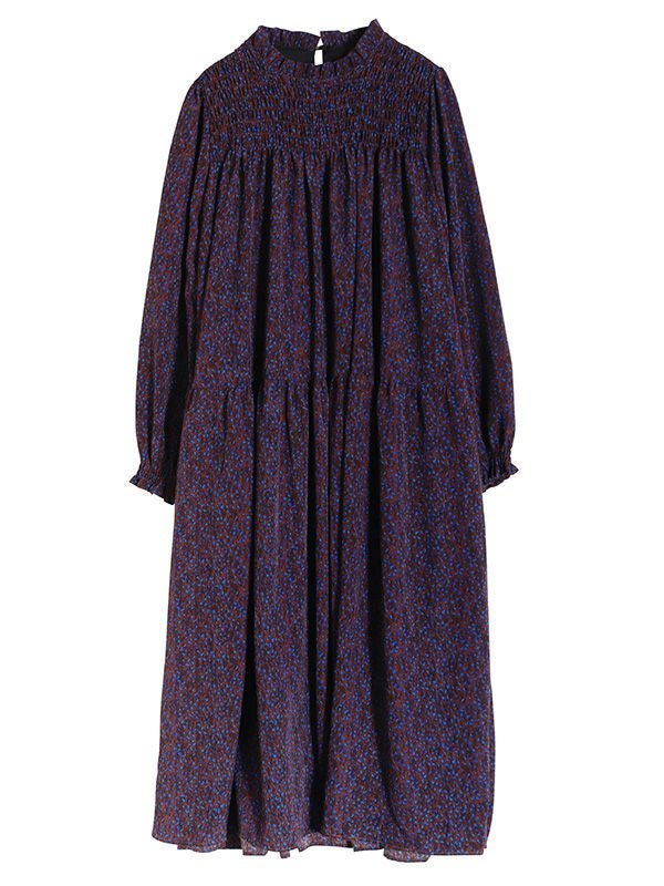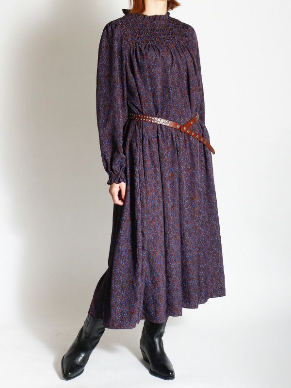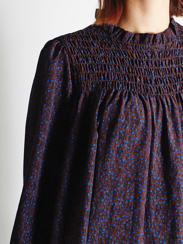 小粒のランダムなドット柄が柔らかな印象の一枚。デコルテラインにシャーリングを施すことで奥行きのある表情に仕上げました。フンワリと軽やかな雰囲気が、フェミニンムードを加速してくれる1枚。柔らかな生地感なので上からベルトをしてウエストマークをした着方もおススメです。カーディガンやブーツでフェミニンに仕上げるのはもちろん、デニムやニットベストなどレイヤードスタイルでカジュアルダウンした着こなしもおすすめです。
