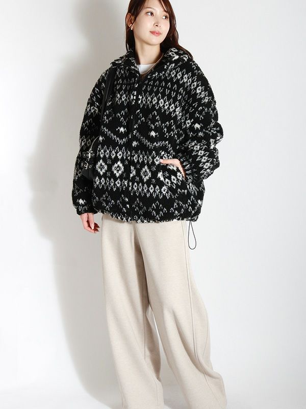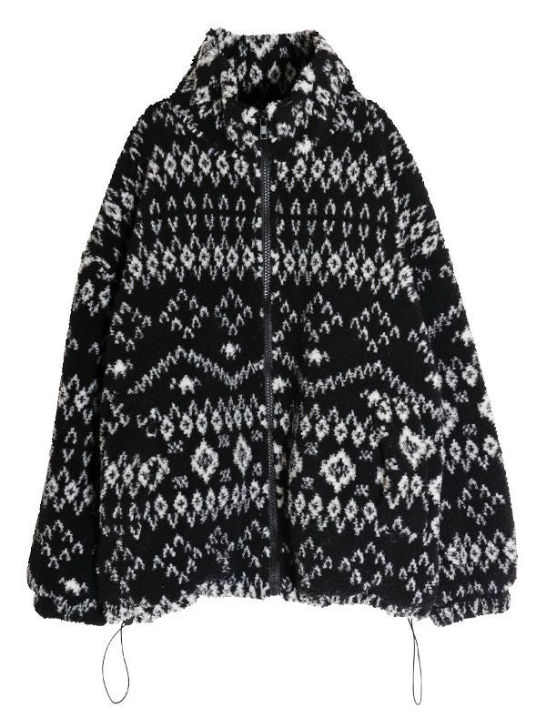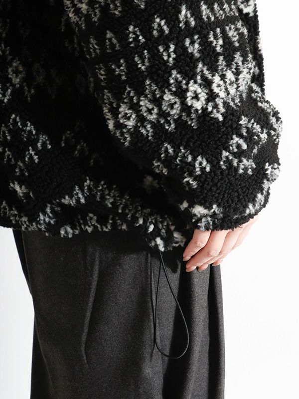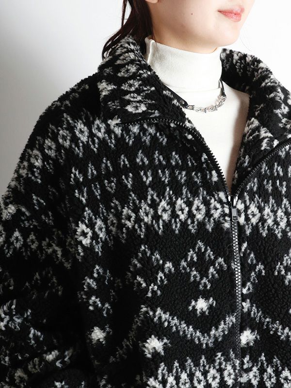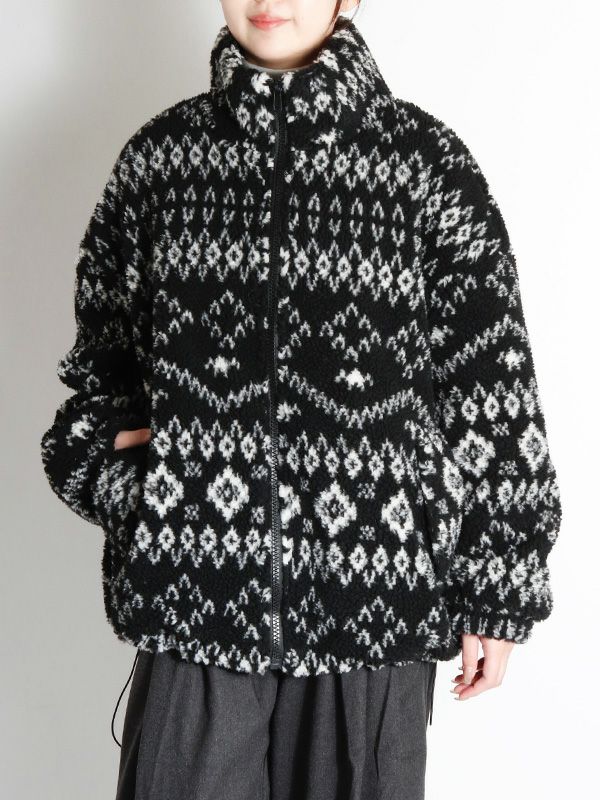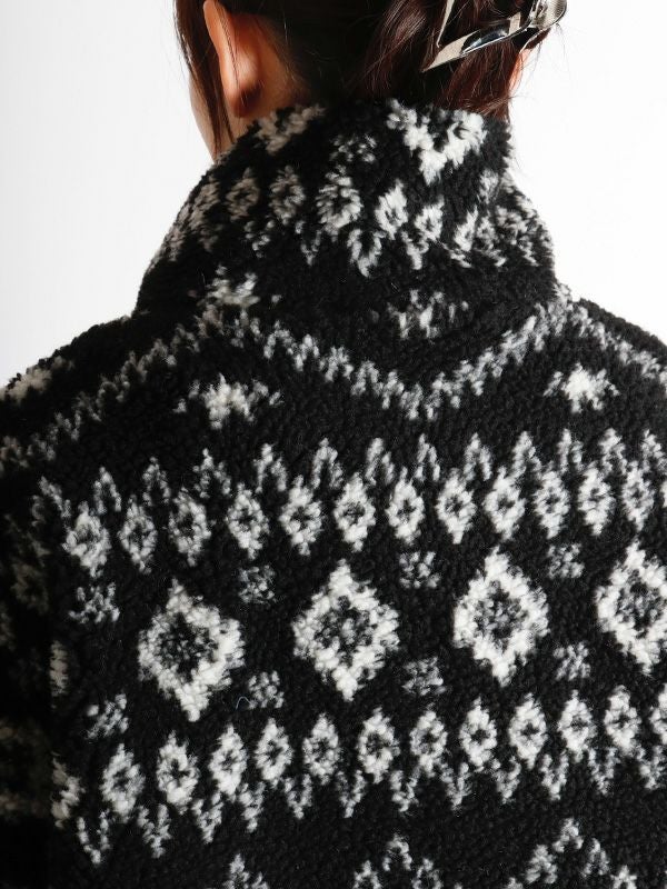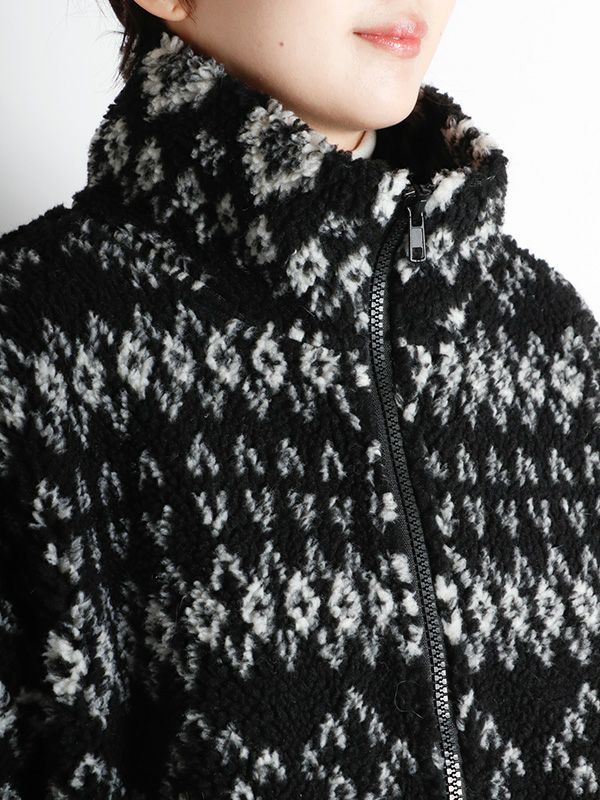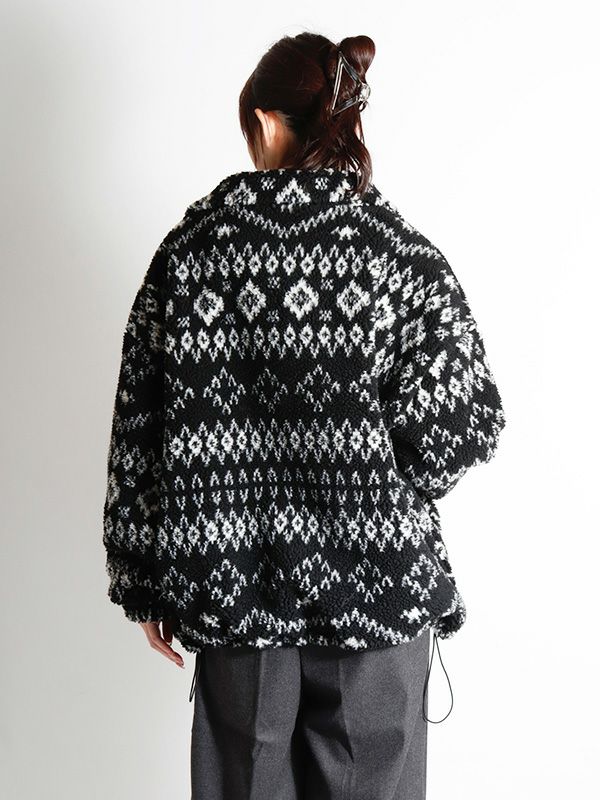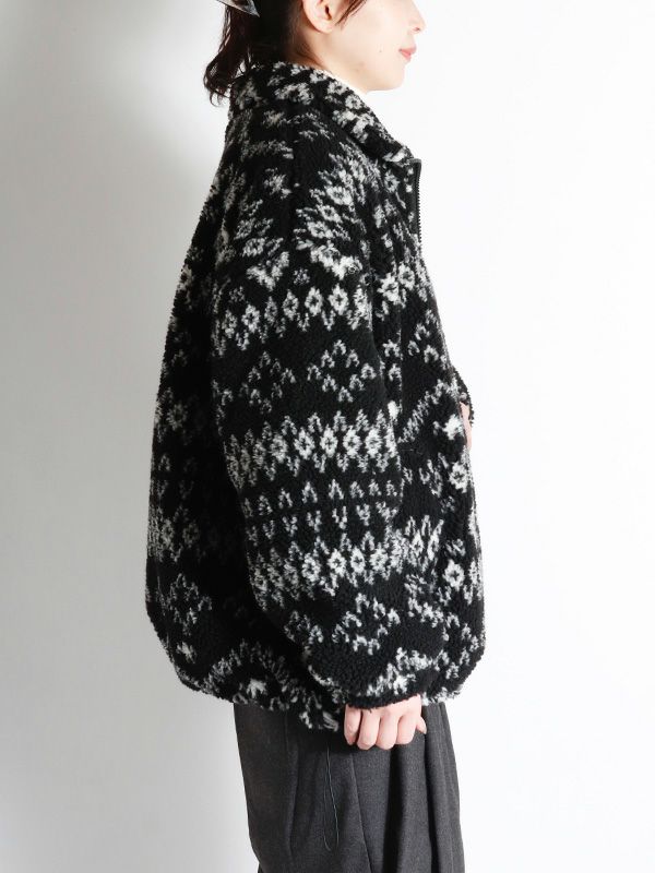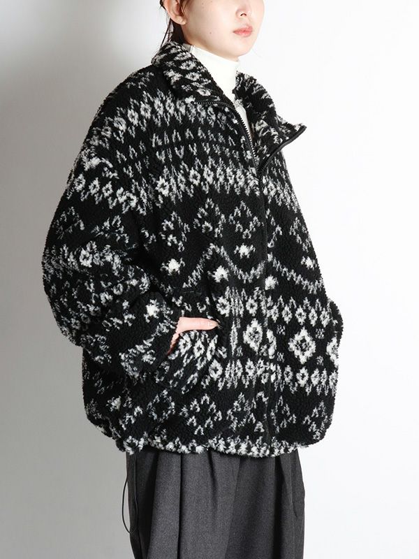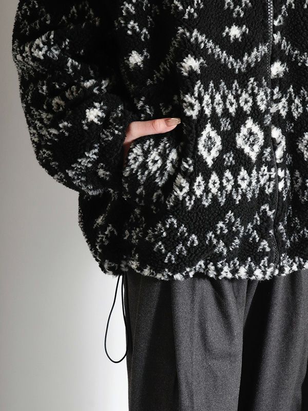シーズンムード高まるボア素材のジップアップブルゾン。落ち着きのあるカラーリングと大胆にデザインされたノルディック柄がポイント。ヒップにかかる着丈と身幅と袖にたっぷりとゆとりを持たせたシルエット。裾はドローコードが付いているのでシルエットの調整をしていただけます。存在感のあるテキスタイルですがシンプルなカラーリングなので、デニムやカーゴパンツ、スカートといった定番アイテムと合わせても、バランスよくコーディネートできます。外出時にさっと羽織るだけで、カジュアルスタイルが完成するブルゾンです。