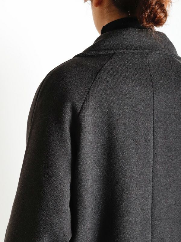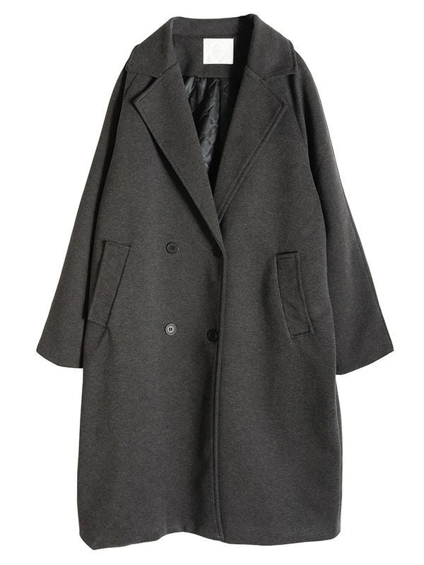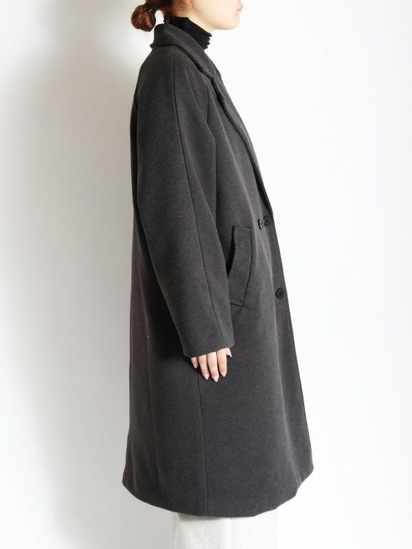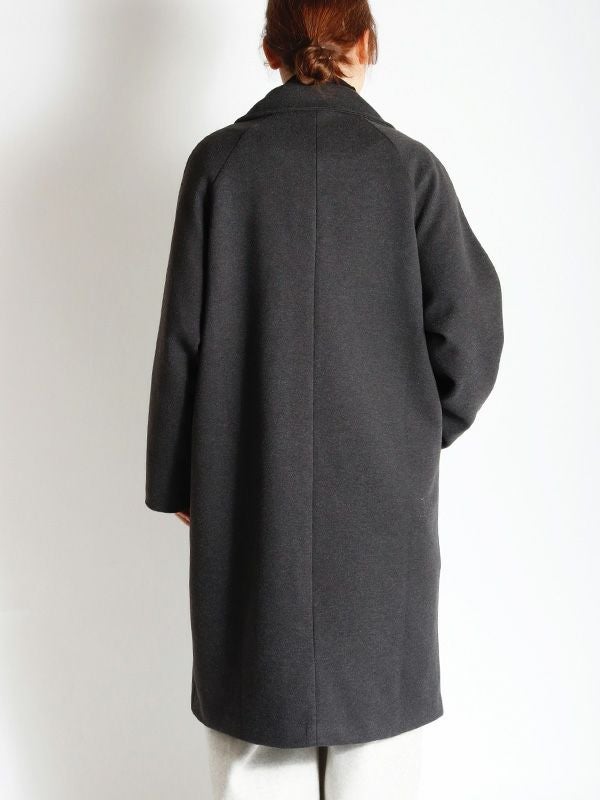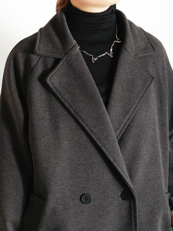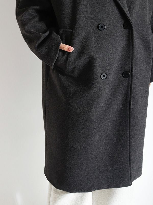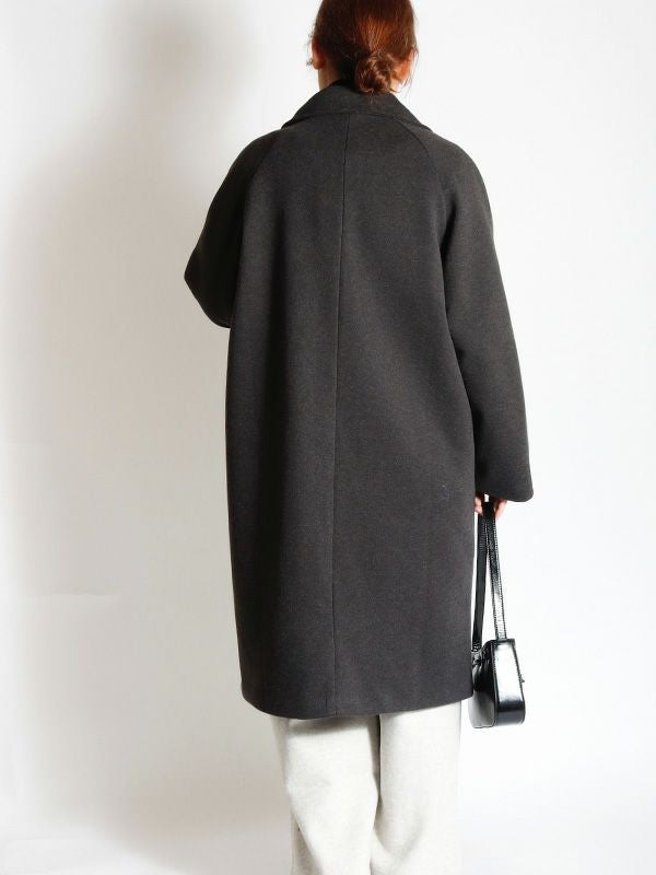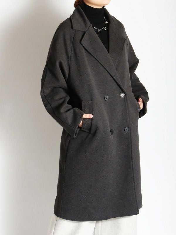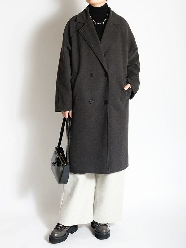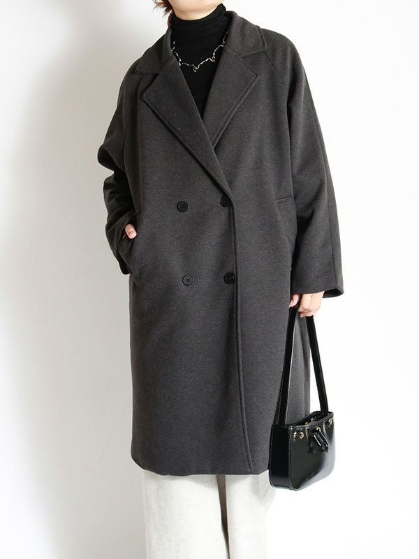 エフォートレスな上品さを纏うダブルのテーラードコート。動きやすさとスッキリとした肩回りで着ていただけるラグランスリーブデザイン。膝にかかるミドル丈が、ボトムスを選ばずさまざまなアイテムと相性抜群です。シンプルながら洗練された佇まいで大人の雰囲気を演出します。ボリュームのあるインナーを合わせても、シルエットが崩れにくい、ゆったりとしたサイズ。幅広いコーディネートにマッチする使い勝手の良いデザインです。